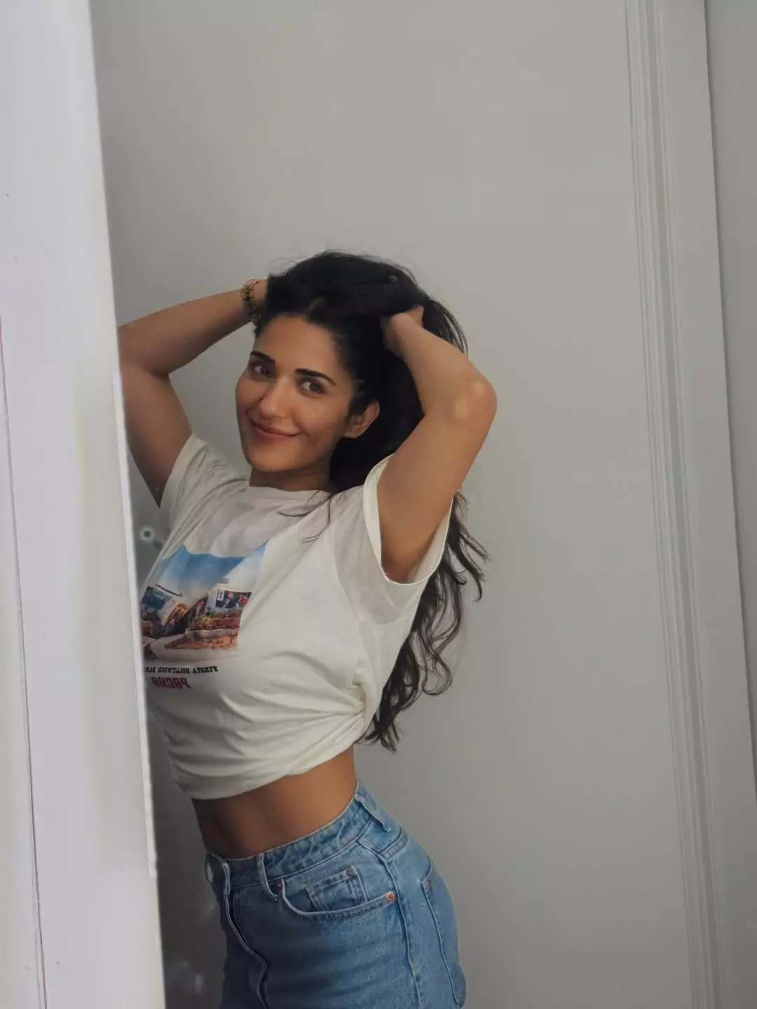 Actress Ruhani Sharma once again proves that effortless style and natural charm never go out of fashion. In her latest mirror selfie, she keeps things minimal yet striking, wearing a fitted full-sleeve crop top paired with relaxed denim. The look highlights her toned silhouette while maintaining a casual, girl-next-door appeal that fans adore.