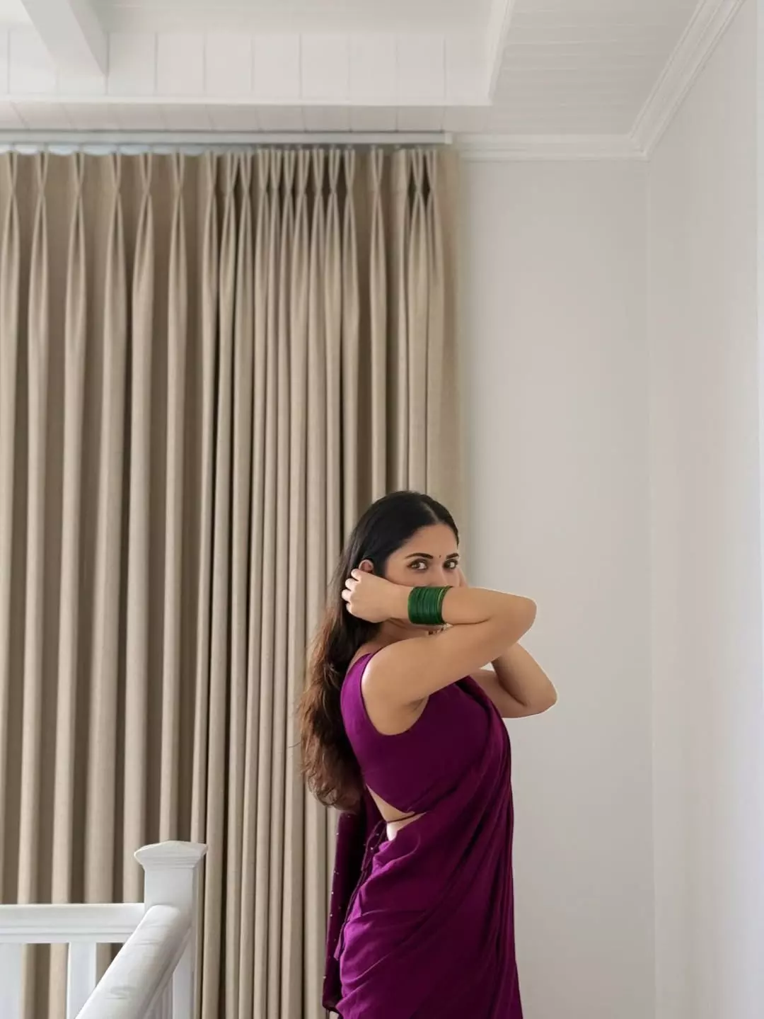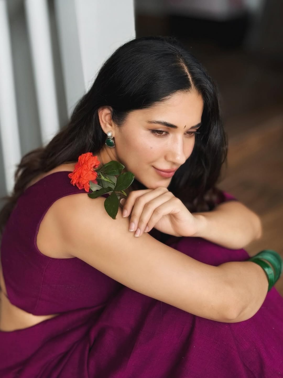 Actress Ruhani Sharma recently shared a picture on Instagram that is winning hearts. In the photo, Ruhani is seen holding a bright orange flower wearing a simple purple saree with green bangles. She looks calm and graceful in the picture.