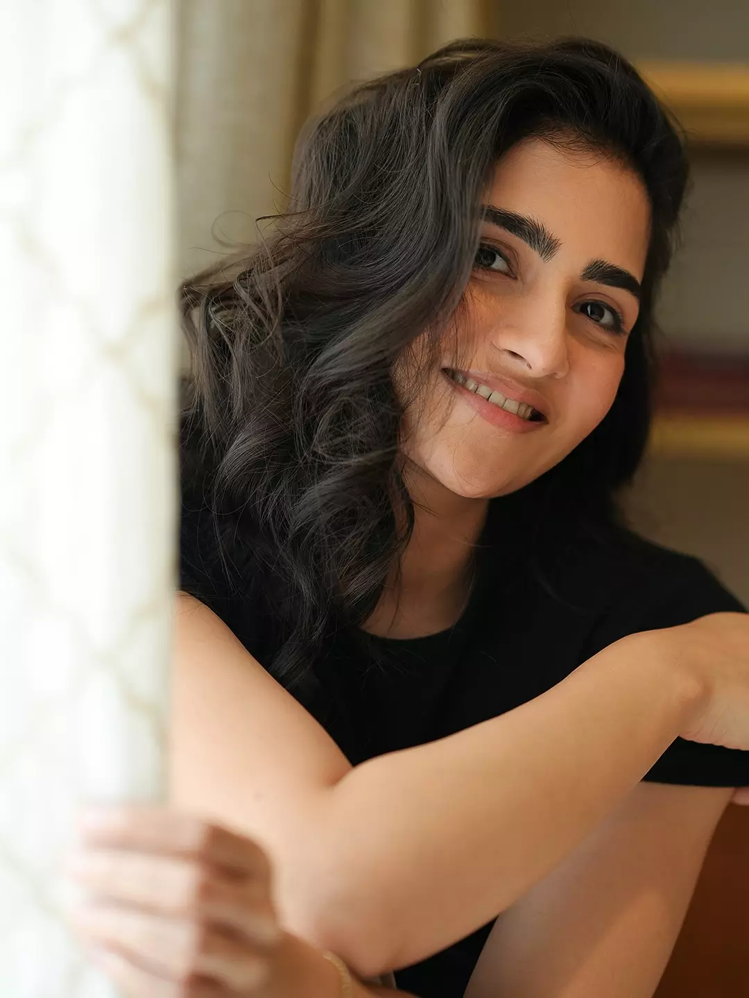 Rukmini Vasanth glows like soft morning light, black tee hugging gently while a pearl bracelet kisses her wrist and gold studs catch the glow.
