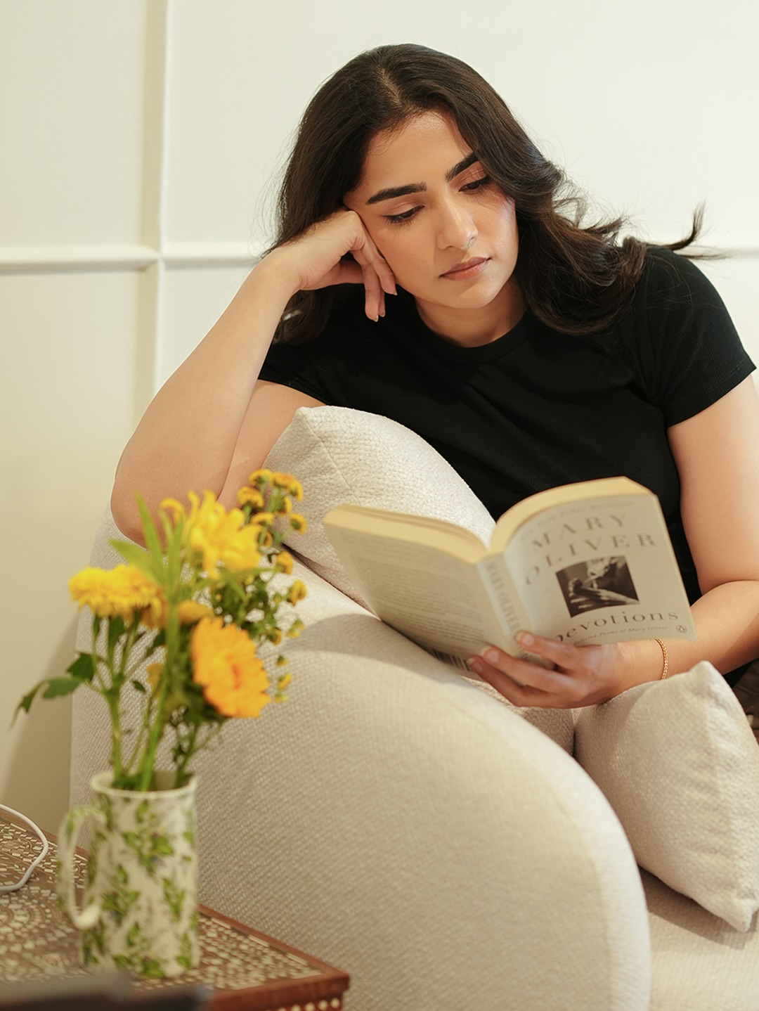 By: Tupaki Desk | 15 Nov 2025 9:30 PM ISTRukmini Vasanth glows like soft morning light, black tee hugging gently while a pearl bracelet kisses her wrist and gold studs catch the glow. One hand cradles a book, the other lifts dark waves from a radiant smile—she’s pure cozy magic. Always a little happier with a book in hand—the Sapta Sagaradaache Ello star just turned quiet corners into her kingdom.