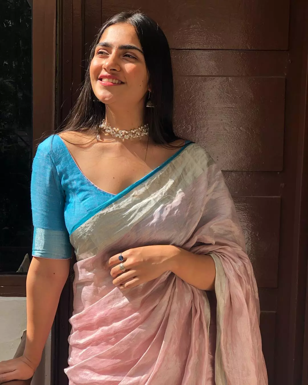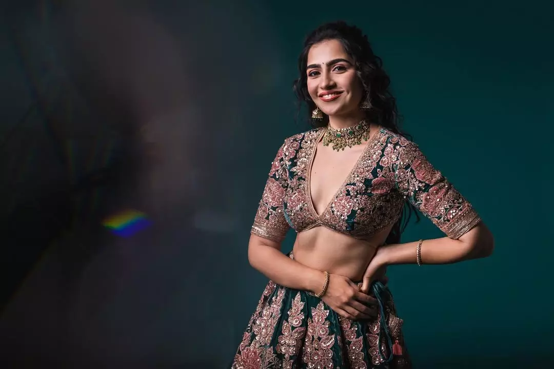 In this radiant studio portrait, Rukmini Vasanth beams with playful charm and elegance, extending her hand toward the camera in a joyful “stop” pose while winking.
