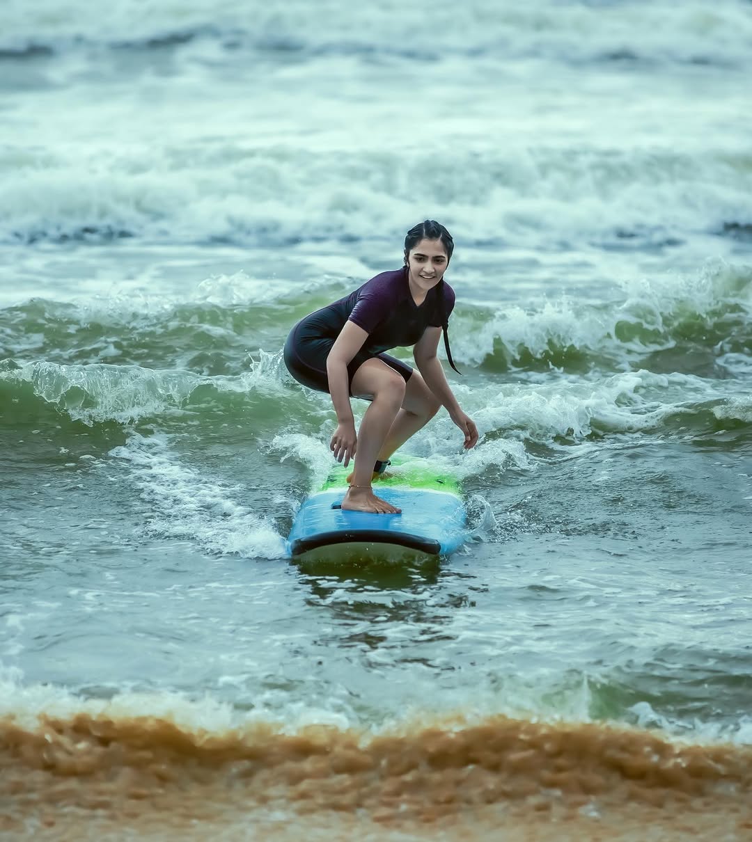 In this radiant studio portrait, Rukmini Vasanth beams with playful charm and elegance, extending her hand toward the camera in a joyful “stop” pose while winking. She shines in a stunning cream-gold gown featuring intricate embroidery, a structured bodice, and dramatic draped fabric that adds regal flair.