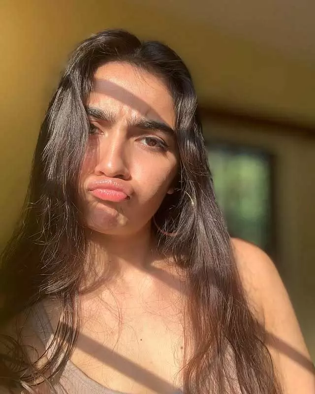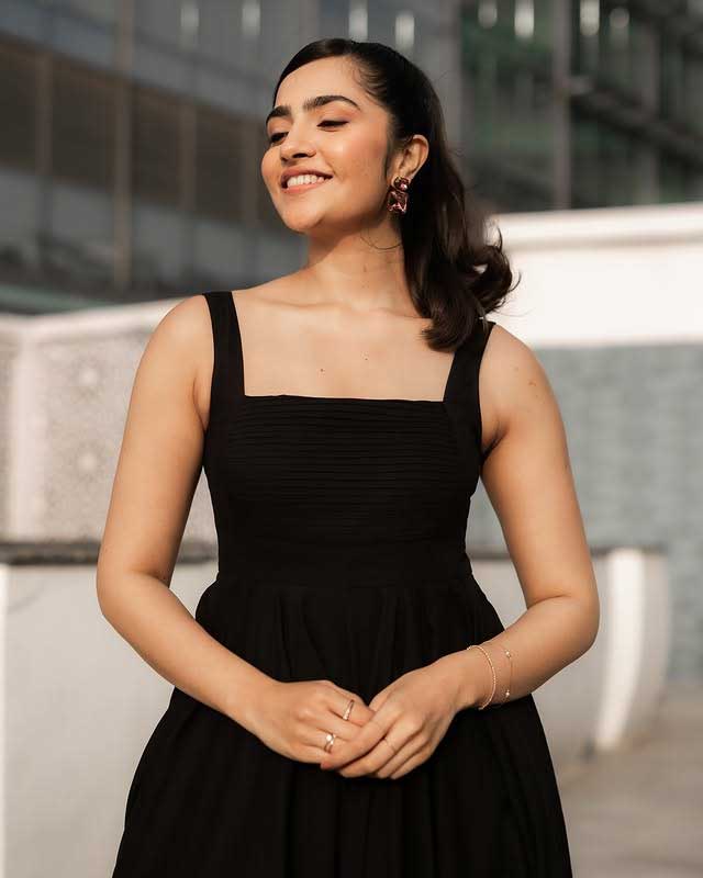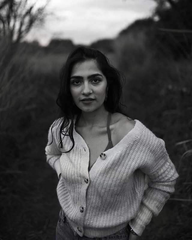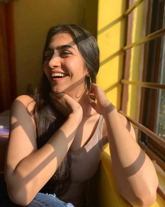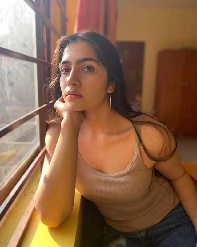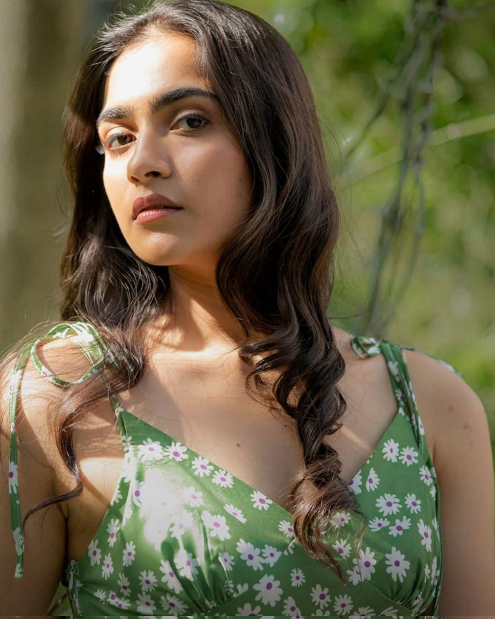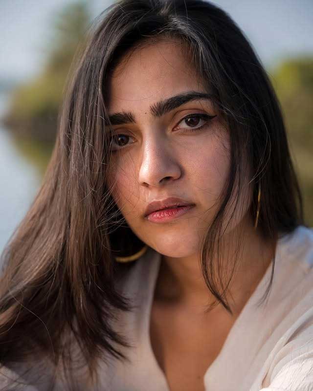 Rukmini Vasanth, the charming Kannada actress, delights fans with her adorable photo collections capturing natural, playful vibes. In this cute snapshot, she beams with a playful pout and furrowed brows under golden sunlight, her long dark hair flowing freely against a warm outdoor backdrop. The casual tank top and effortless glow highlight her youthful, relatable charm, radiating innocence and fun—perfect for her "cute" aesthetic that wins hearts on social media.