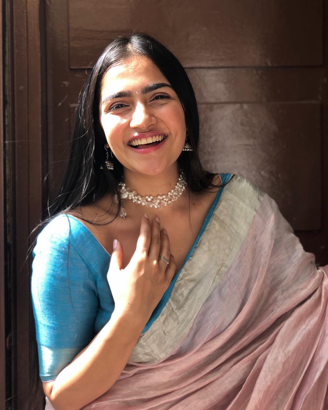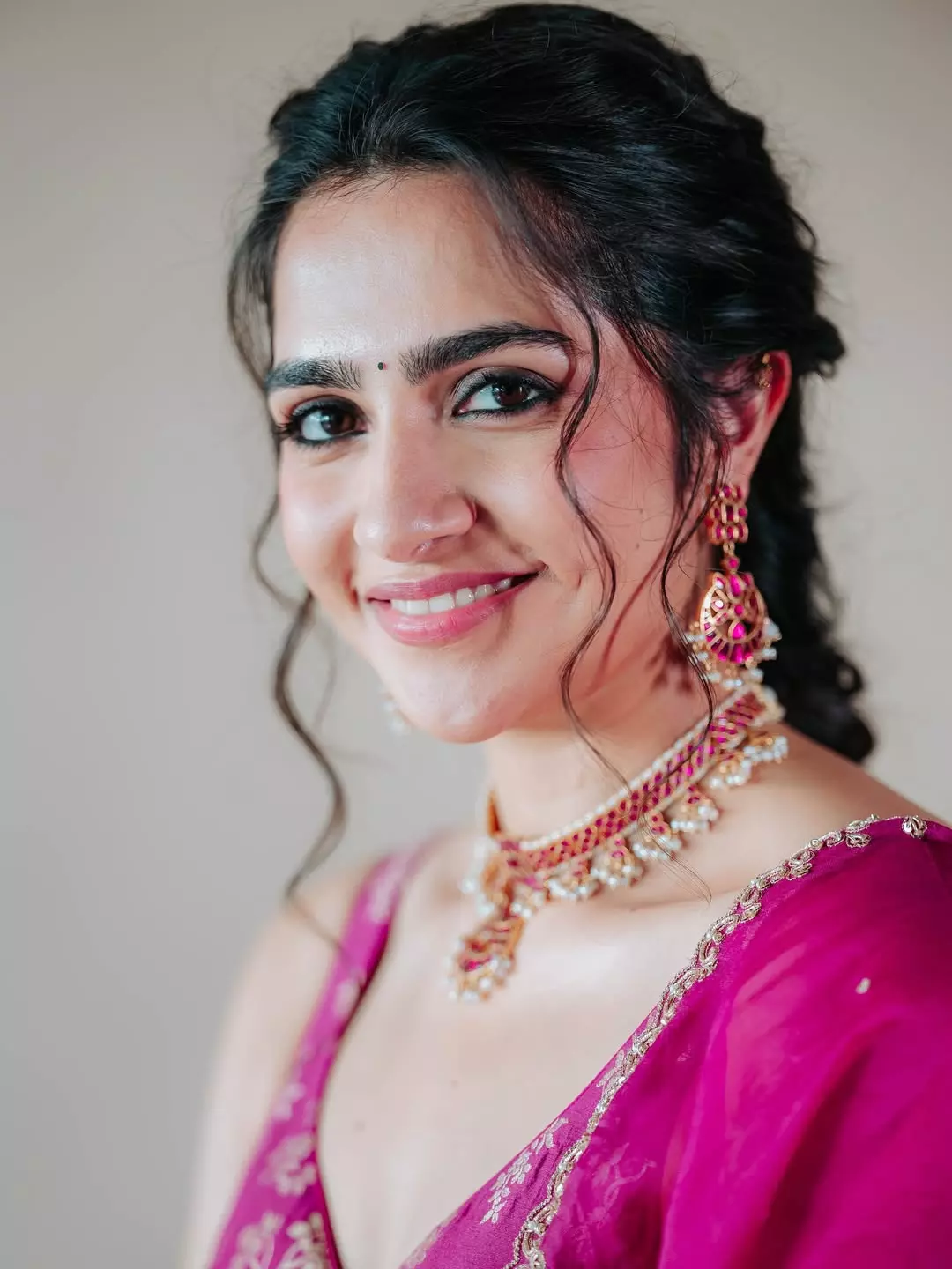 Rukmini Vasanth is seen in a stylish pink dress in the Instagram picture. The dress has intricate embroidery,l and the back features a detailed design