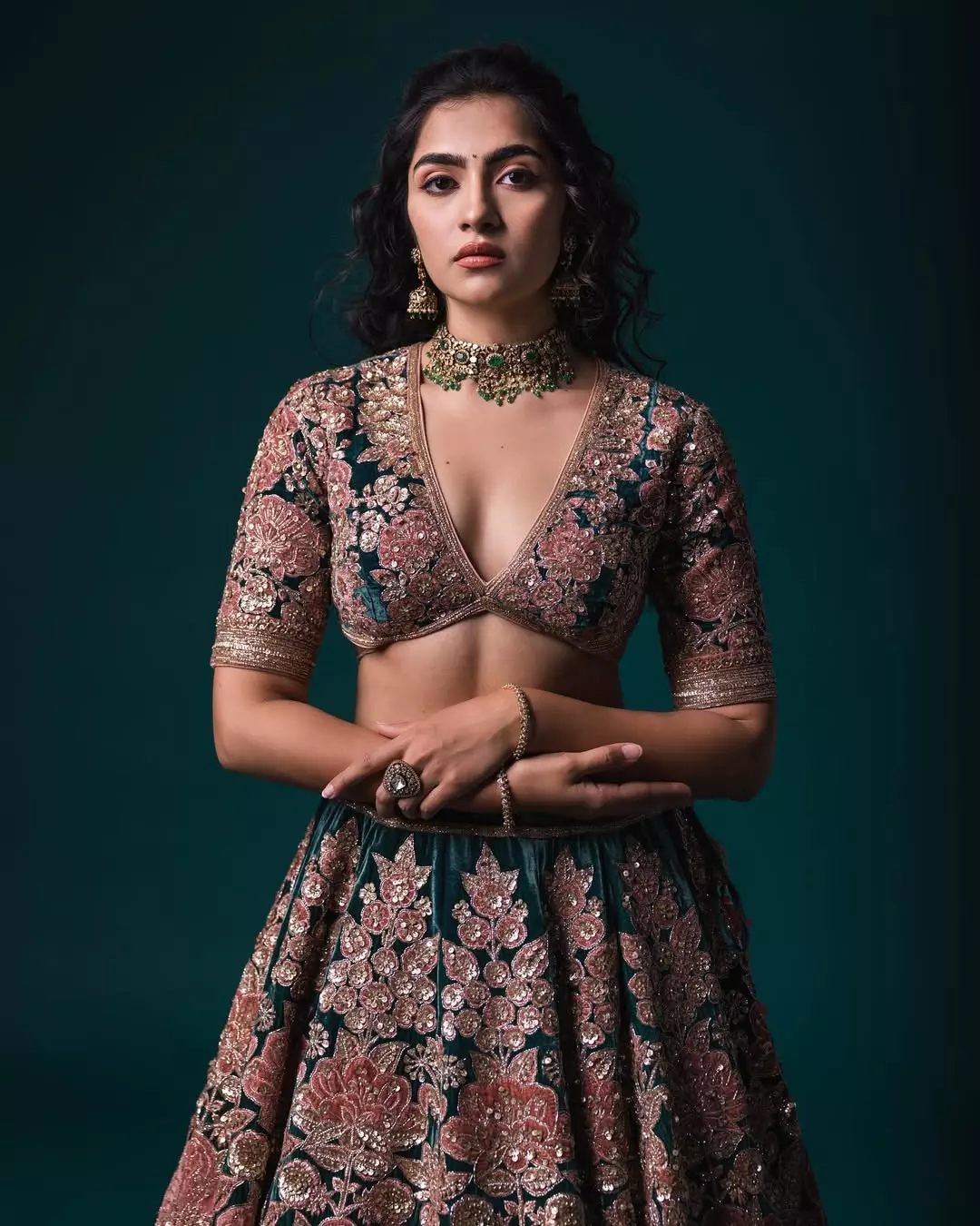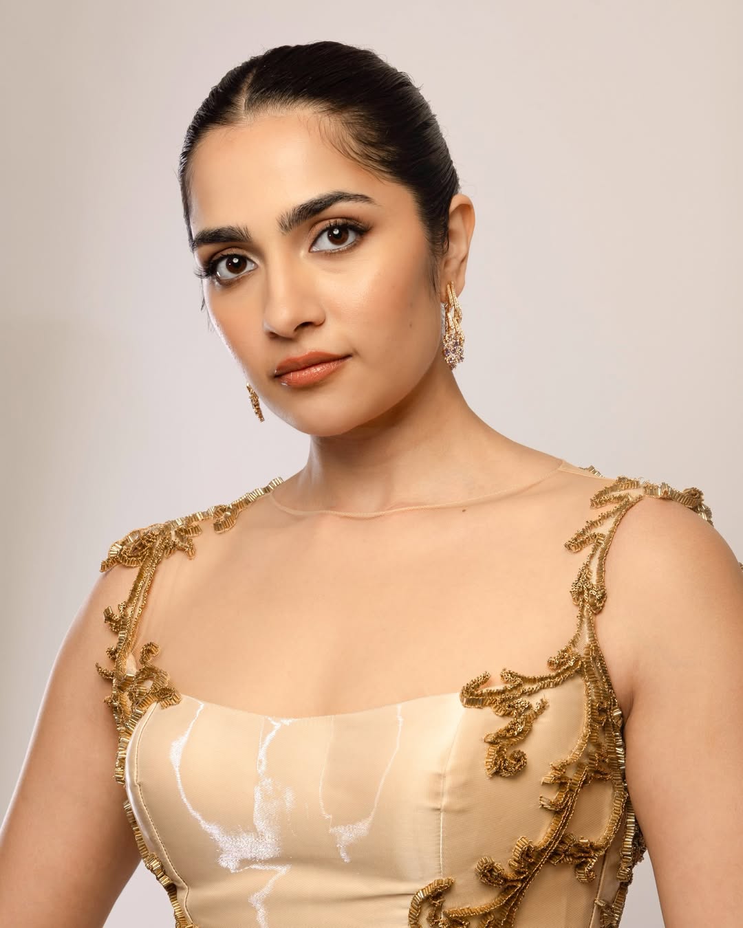 This captivating studio portrait of Rukmini Vasanth showcases her intense gaze and effortless elegance in a shimmering gold off-shoulder outfit.