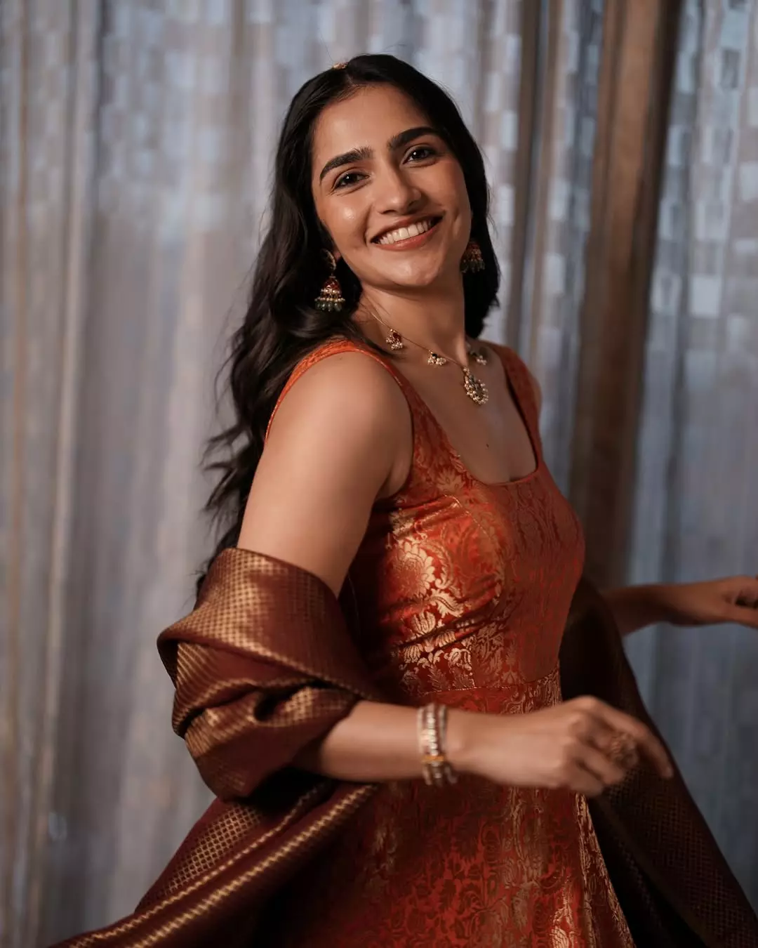 Rukmini Vasanth Stuns in Gold Off Shoulder Outfit with Ethereal Charm