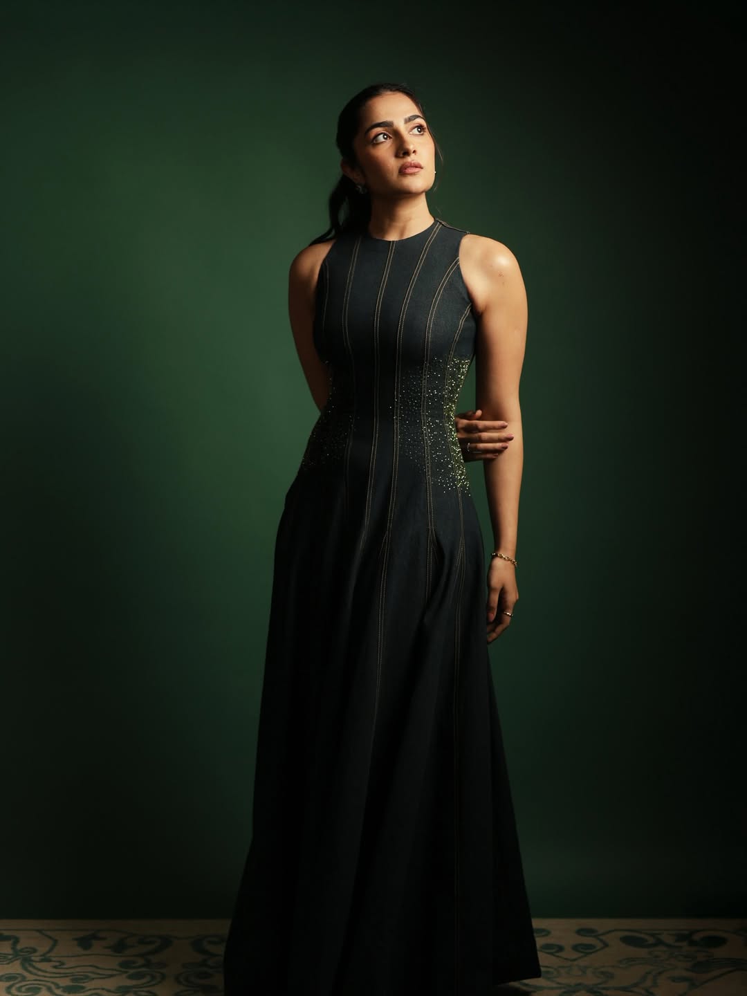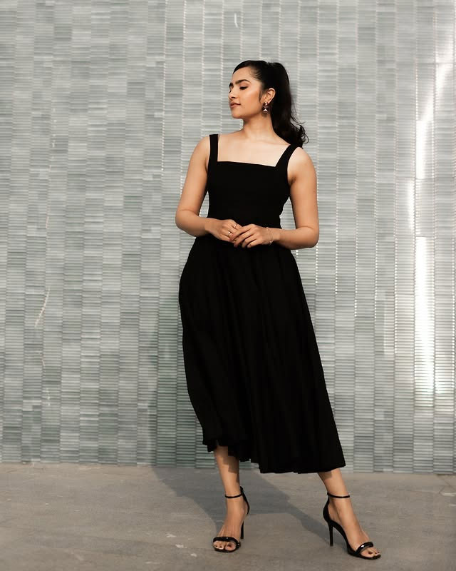 Rukmini Vasanth recently shared a stylish photo on Instagram that caught everyone’s attention. In this picture, she is seen wearing a black shimmering dress with a strong vintage touch. The look gives a clear 1970s vibe, which she herself described as “A little 70s moment.”