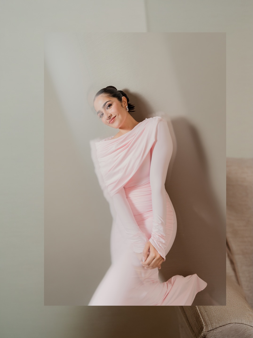 Draped in a soft off-shoulder gown from @deme_love_, she brings effortless grace and dreamy charm to the frame.