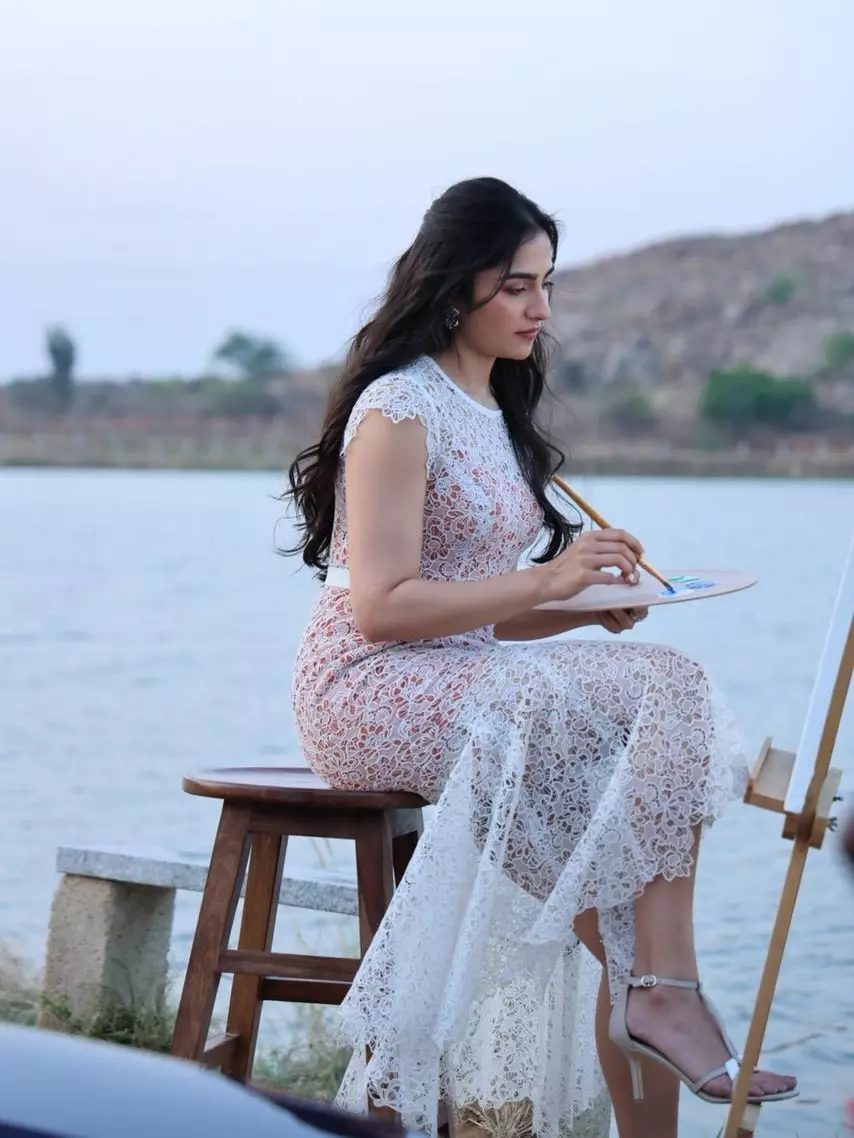 Radiating grace and effortless charm, Rukmini Vasanth captivates in this serene gallery moment set amidst lush greenery and soft natural light. Dressed in a delicate ivory lace ensemble, she blends elegance with a modern aesthetic, making a quiet yet powerful style statement. The intricate detailing of her outfit paired with minimal accessories allows her natural beauty to shine, while her poised stance adds a touch of confidence to the frame.