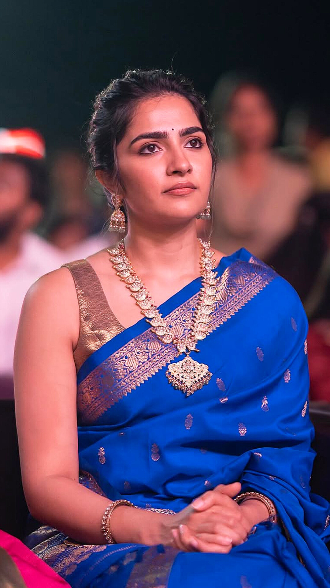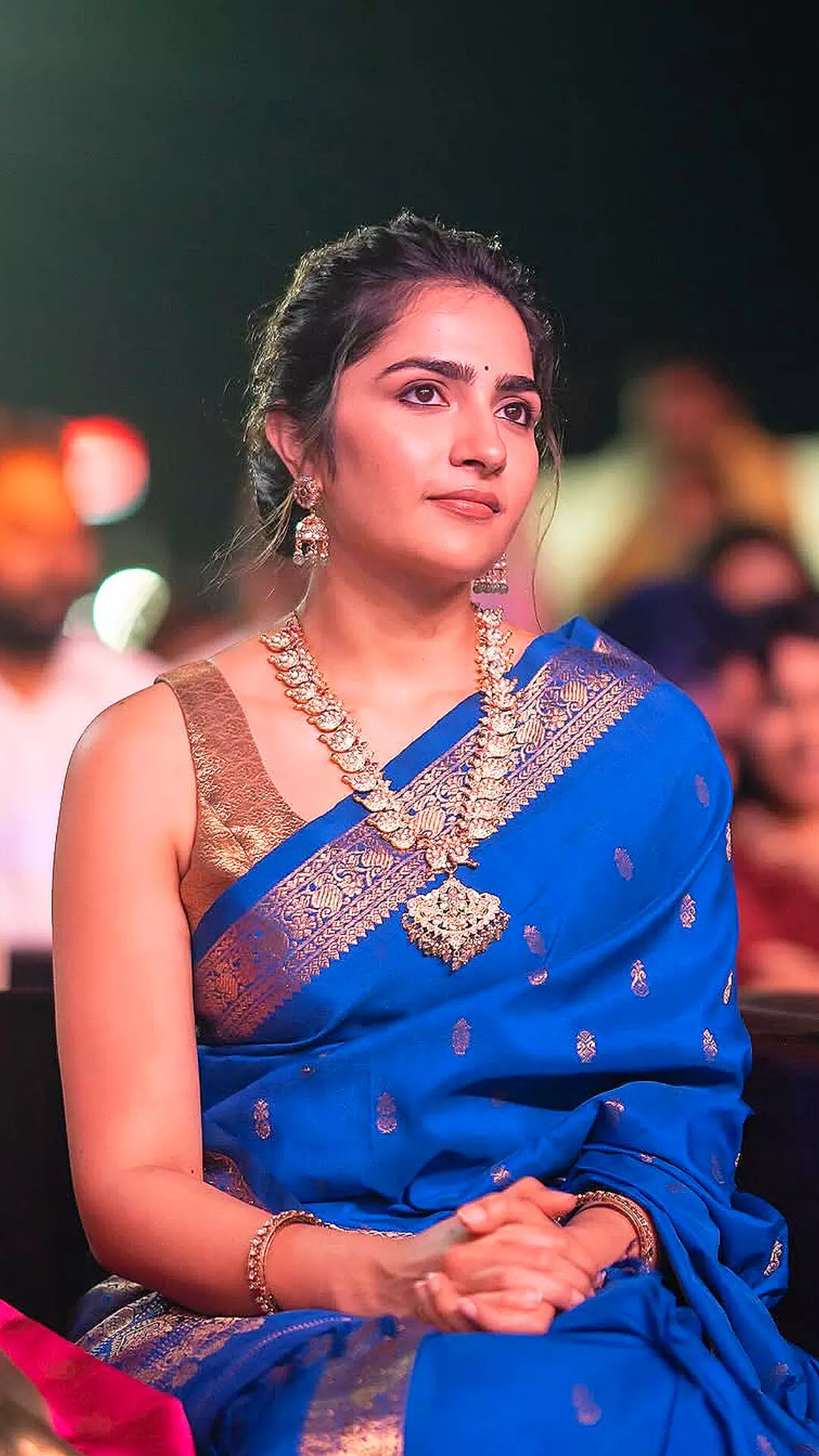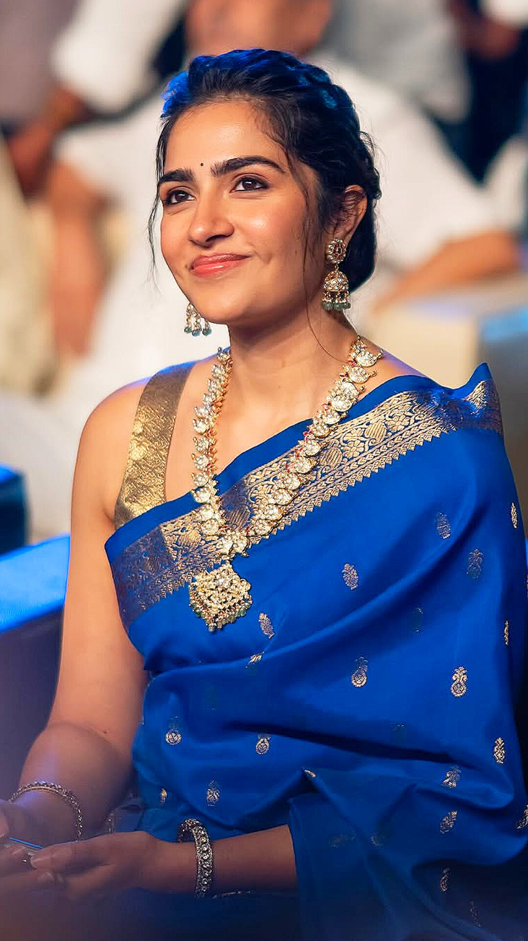Actress Rukmini Vasanth recently mesmerized fans with her graceful appearance in a stunning blue saree. The rich hue, paired with intricate golden detailing, perfectly complemented her radiant smile and natural charm. Her elegant jewelry and minimalistic styling enhanced the traditional look, making her the center of attention at the event. Rukmini’s poise and confidence in the saree exemplify her impeccable sense of fashion and effortless elegance.