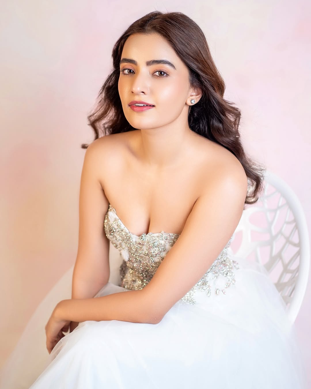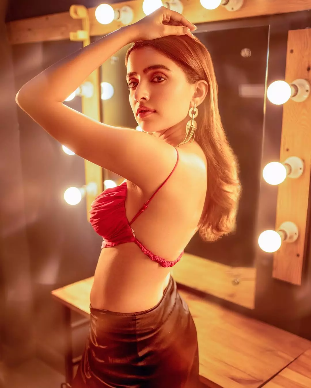 Rukshar Dhillon exudes joy and freedom in this captivating photoshoot, captured in a grand hallway adorned with ornate chandeliers casting warm golden light. Arms outstretched in a playful embrace, she wears a sleek navy blue halter-neck dress, her wavy hair flowing naturally – a moment of pure, unforgettable bliss.