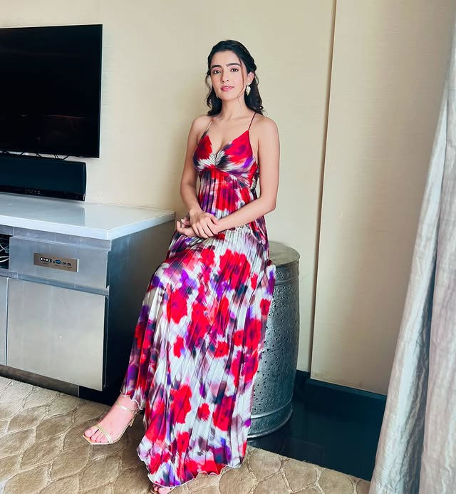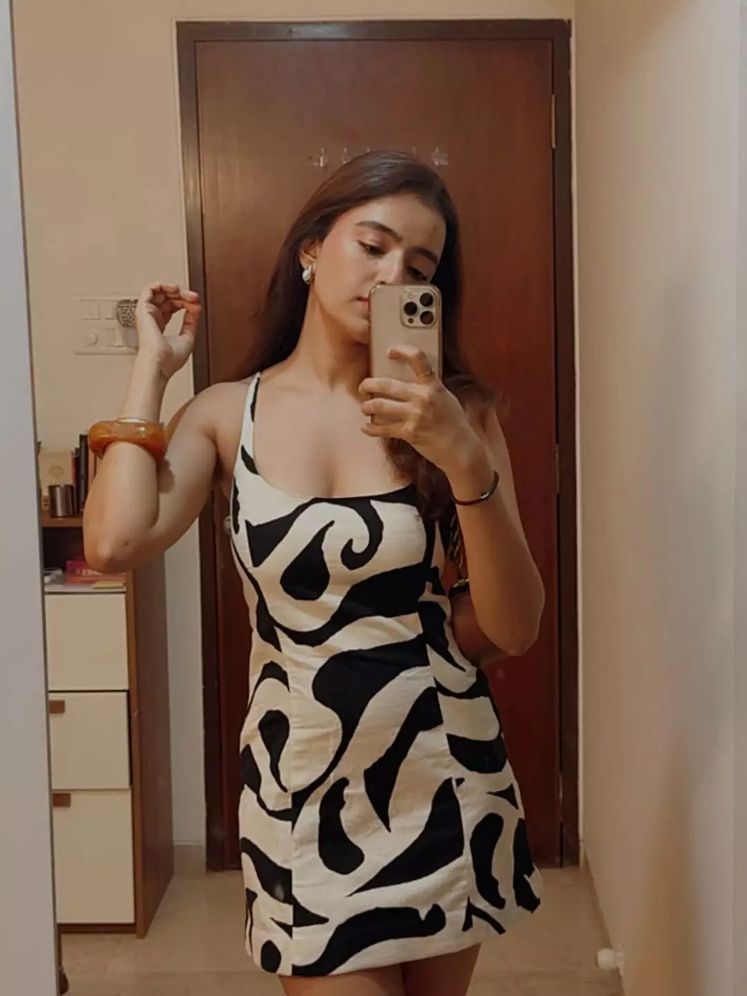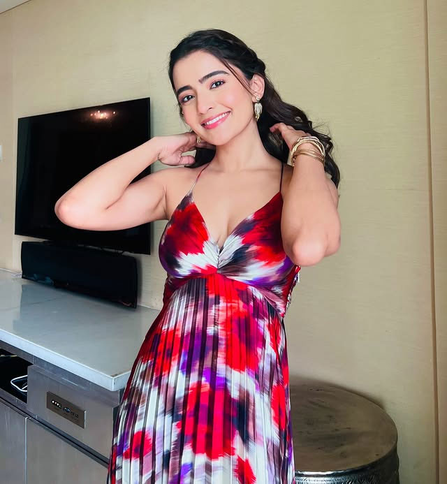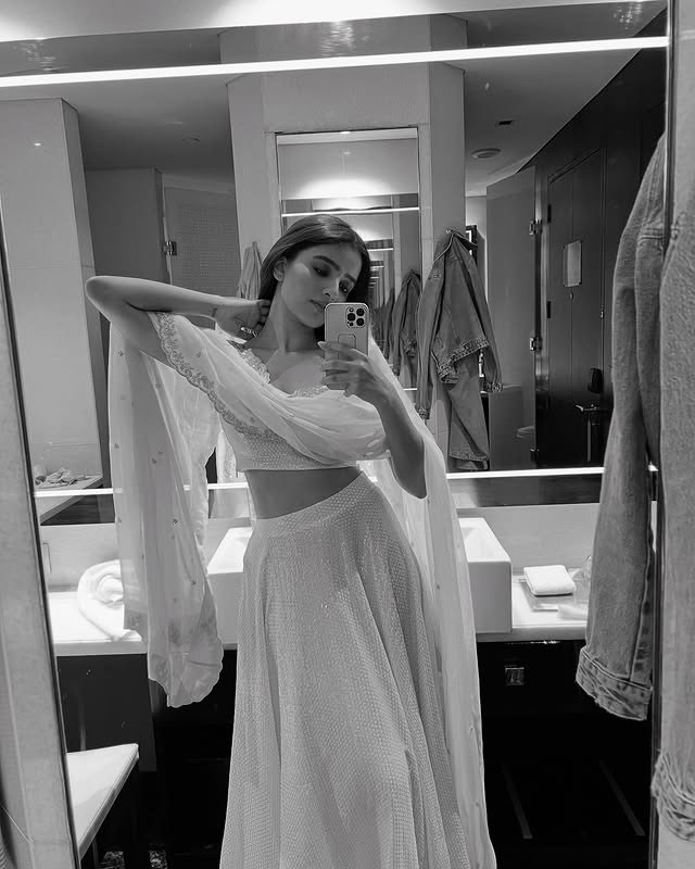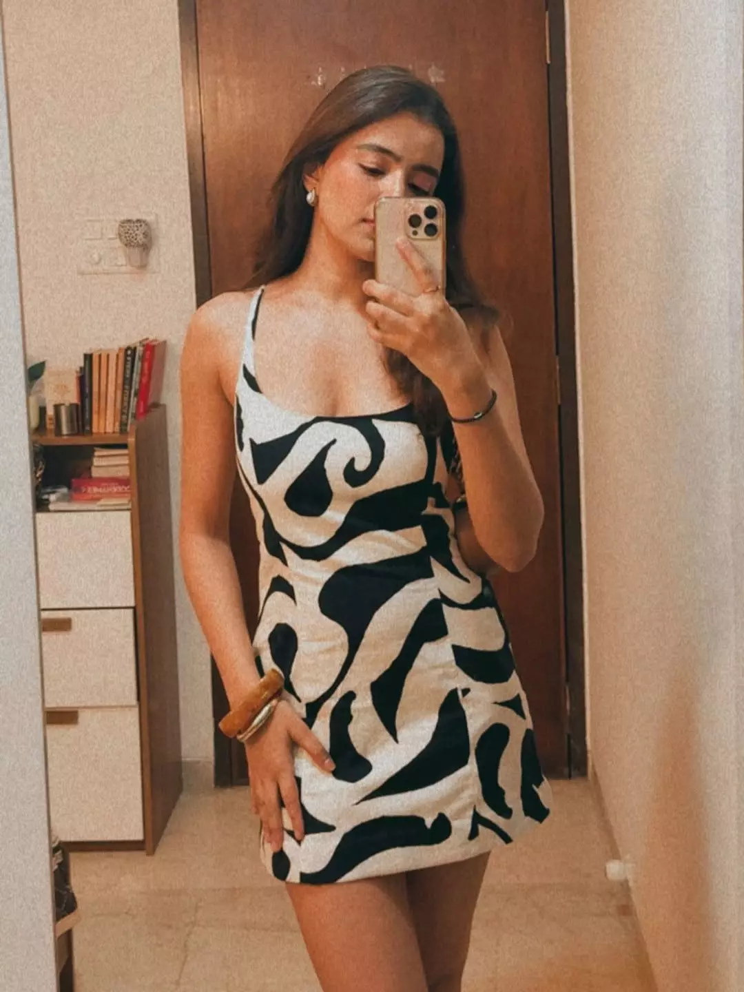 In this confident mirror selfie, Rukshar looks stunning in a bold black-and-white patterned mini dress, perfectly capturing her fashion-forward vibe that complements her on-screen charisma.