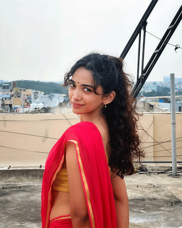 Saanve Megghana sparks playful curiosity in this captivating photo, draped gracefully in a red saree with a dazzling smile that lights up the frame.