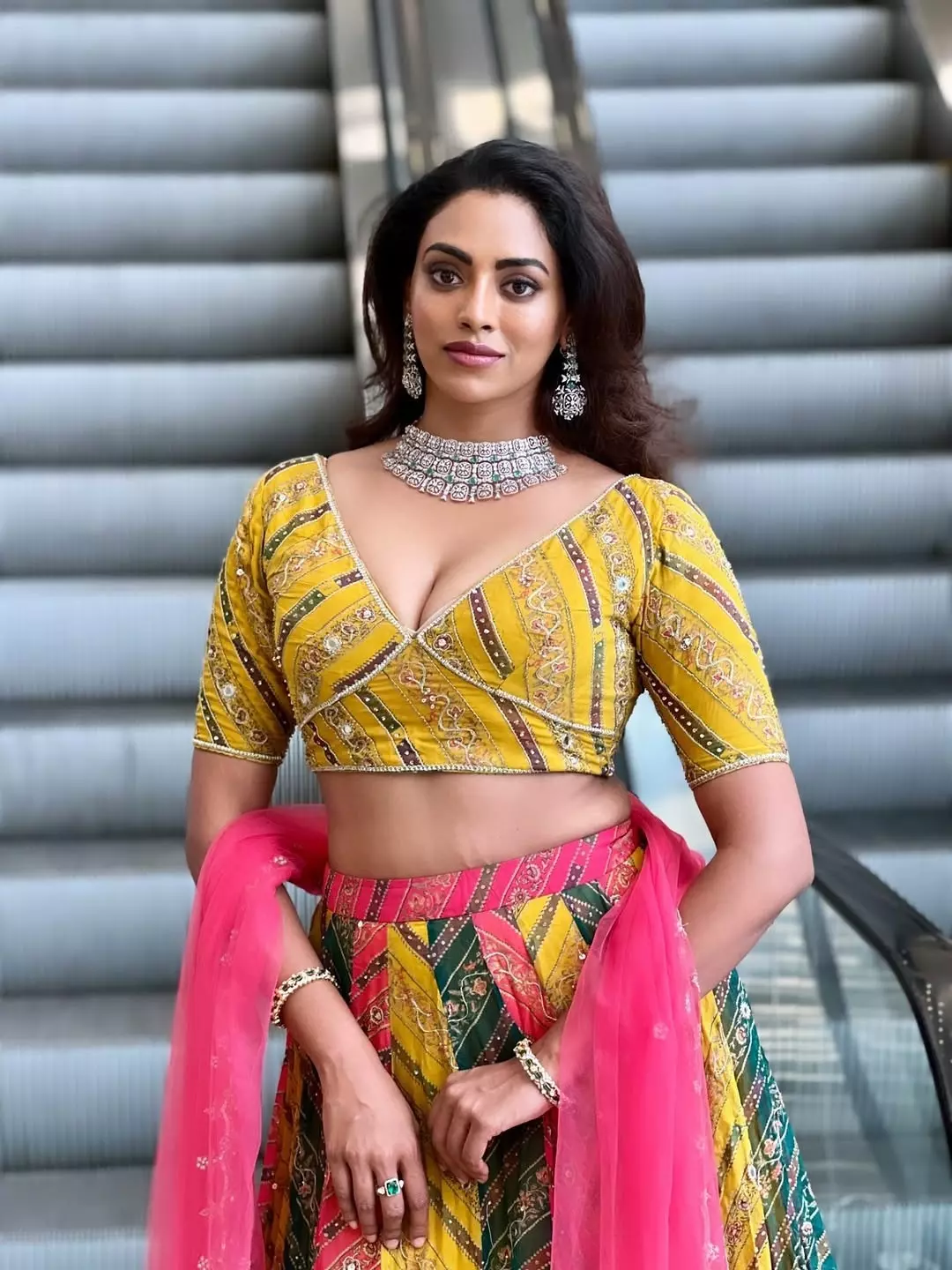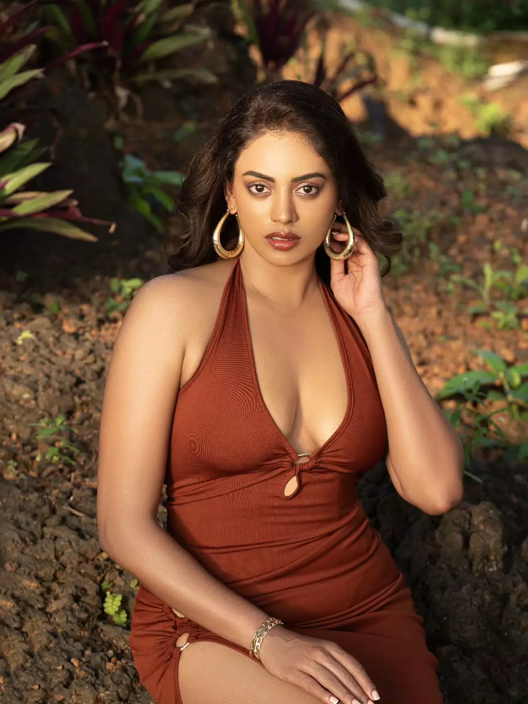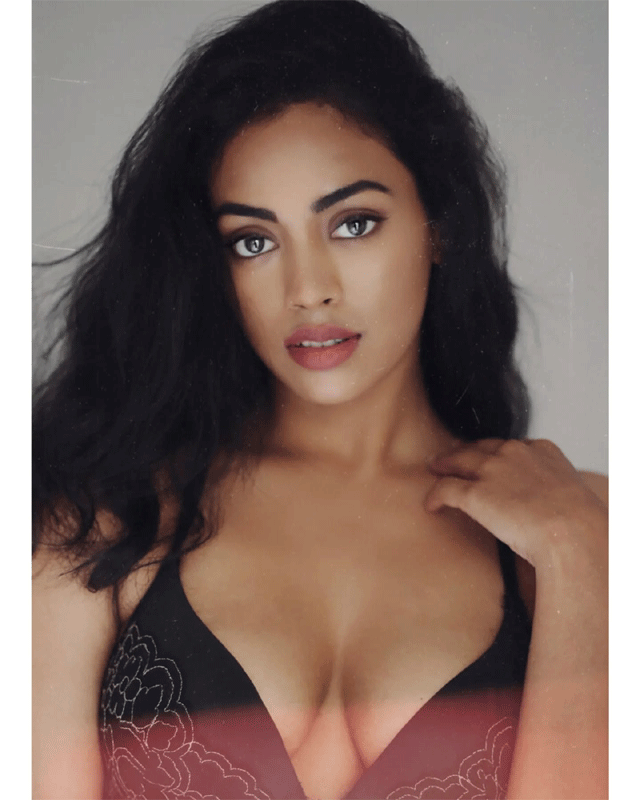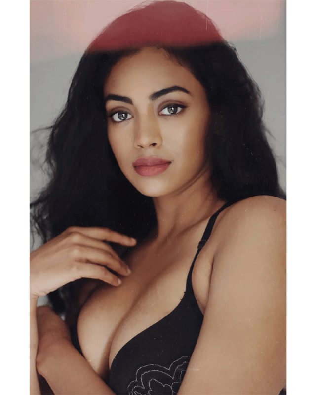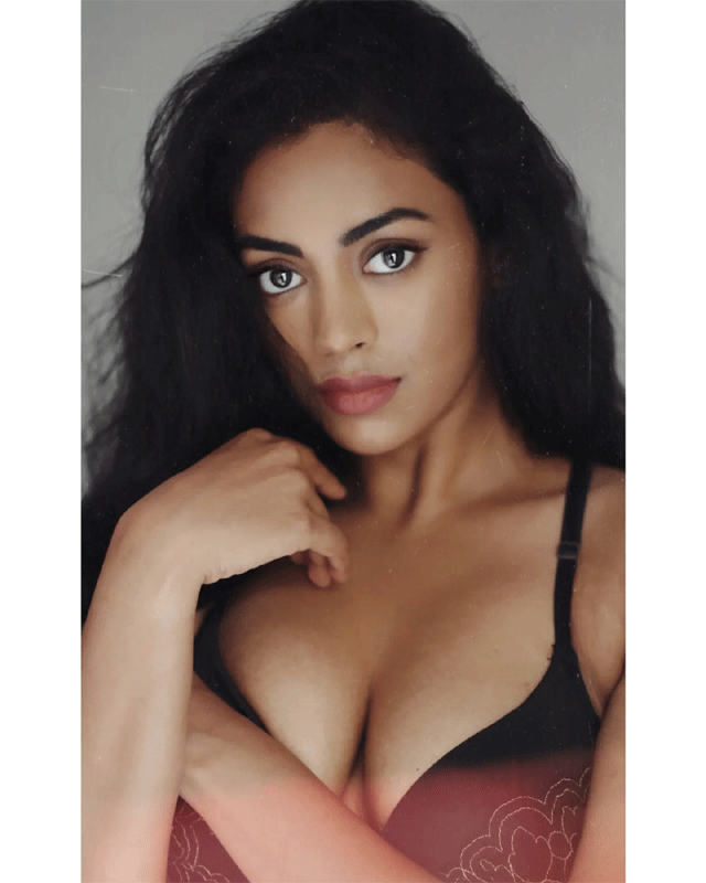 In this captivating studio portrait, Sai Kamakshi Bhaskarla (also known as Kamakshi Bhaskarla) exudes confidence and sensuality. Dressed in a deep plunging peach-orange lace outfit with intricate detailing, she poses gracefully with one hand gently touching her wavy hair, her striking eyes drawing all the attention. The soft lighting highlights her natural beauty, making this a perfect blend of glamour and poise.