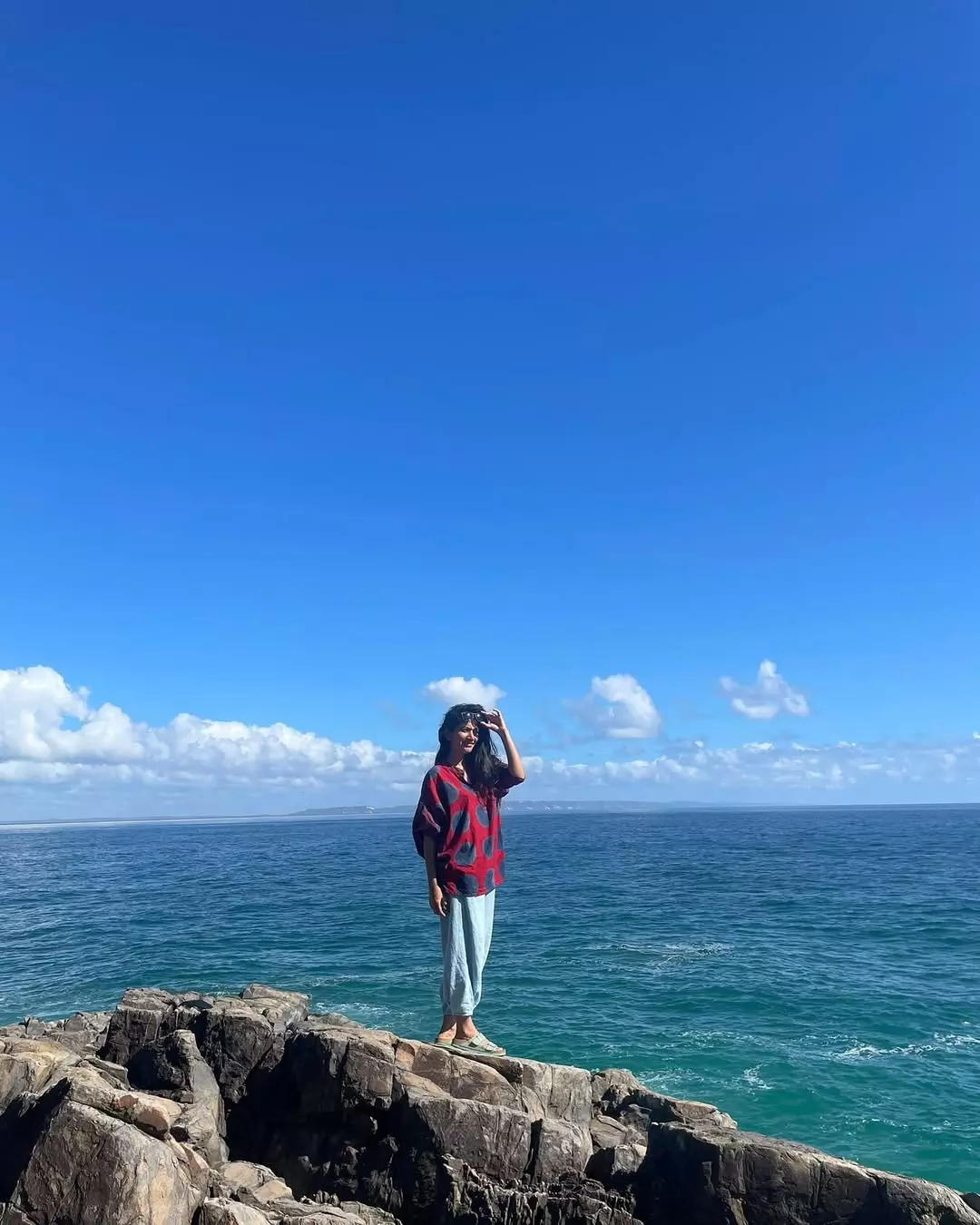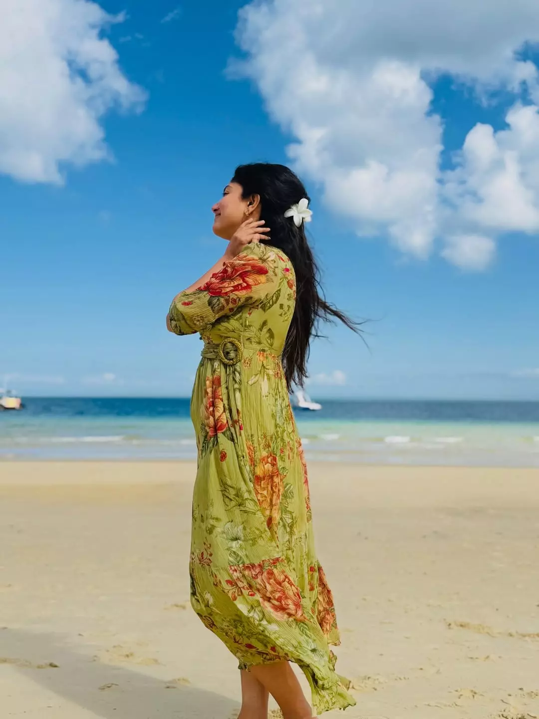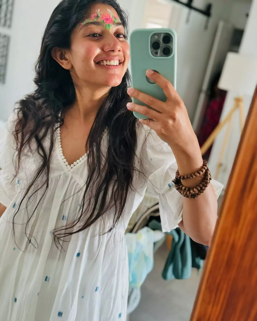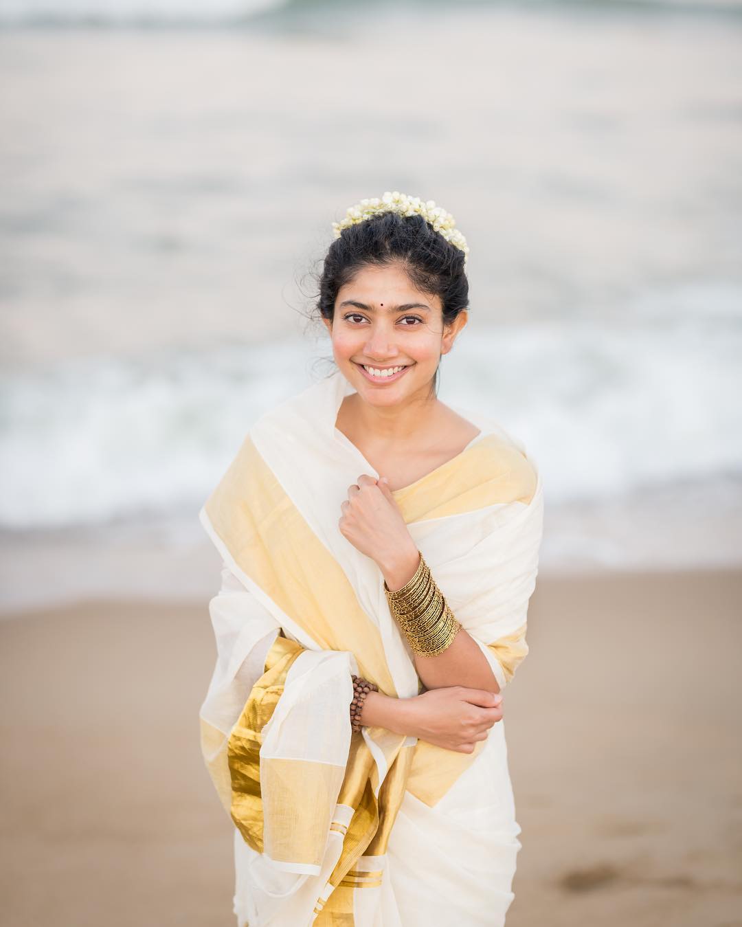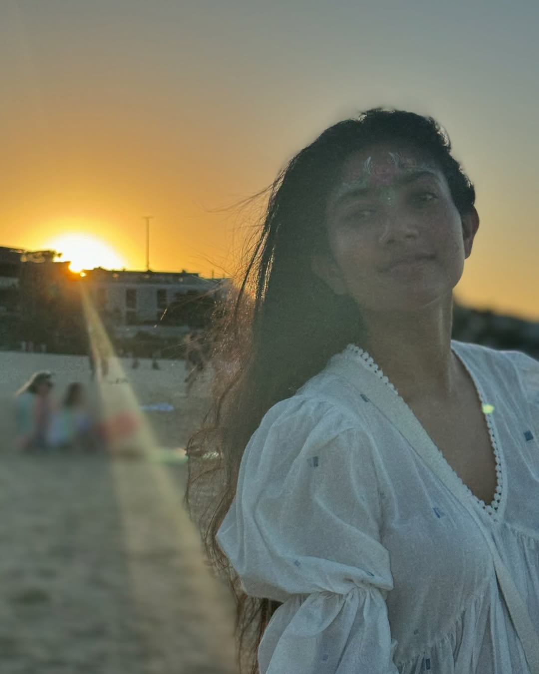 Sai Pallavi is pure sunshine in a single frame! Happie Happie vibes overload as she sits on the golden sand, wind playing with her hair, rocking a breezy white embroidered maxi and the biggest, most contagious smile.