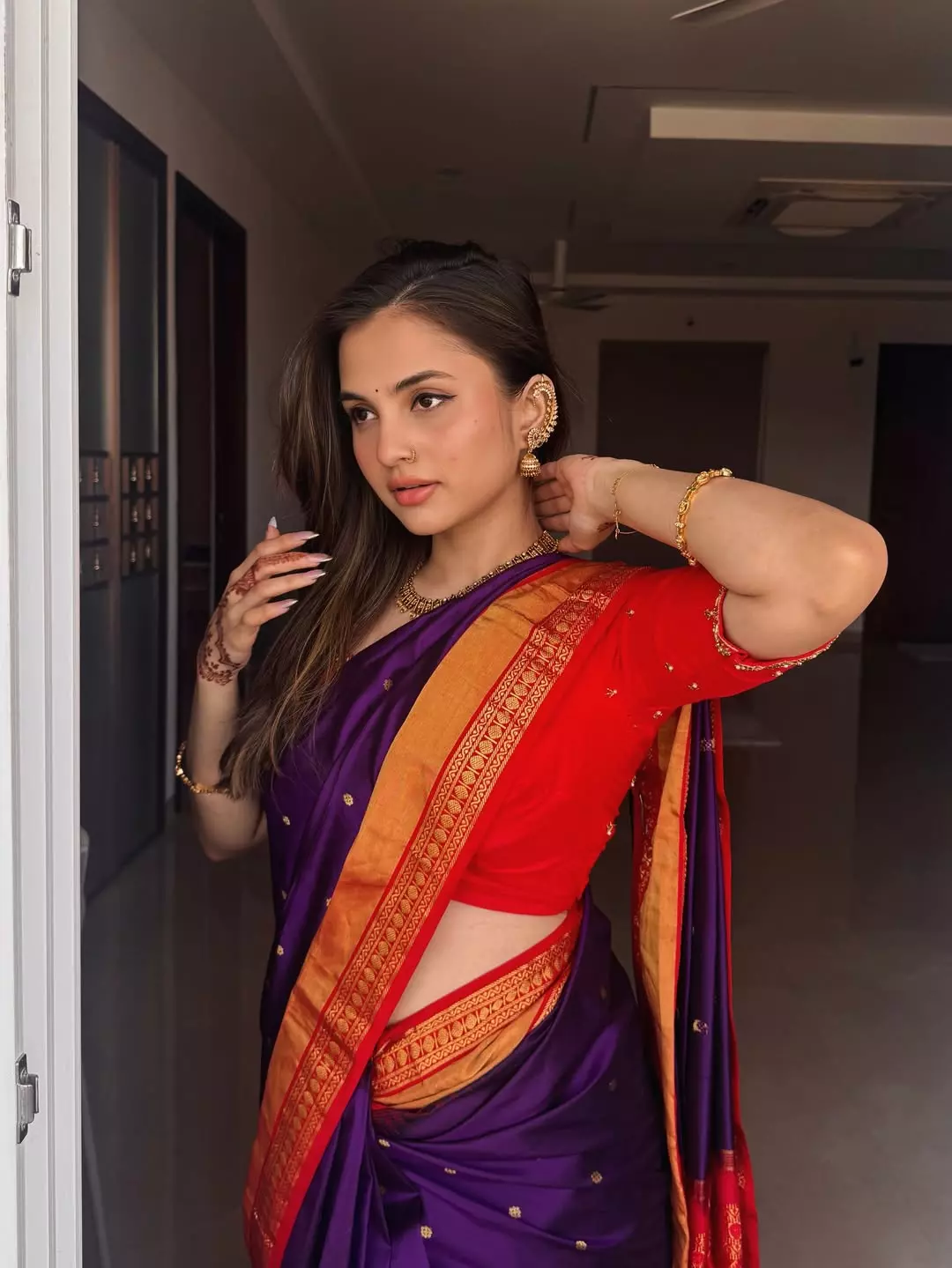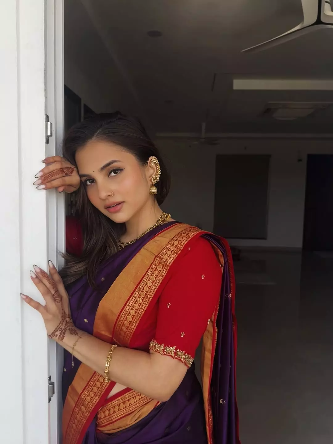 In this beautiful picture, Sai Ramya Pasupuleti is seen wearing a stunning traditional saree that perfectly highlights her natural beauty. The rich purple saree with a vibrant red blouse and golden border creates a striking ethnic look. Paired with traditional jewelry, soft makeup, and neatly styled hair, the actress carries the outfit with confidence and grace. Her poised expression and subtle smile add a timeless elegance to the entire frame, making the look both classy and captivating.