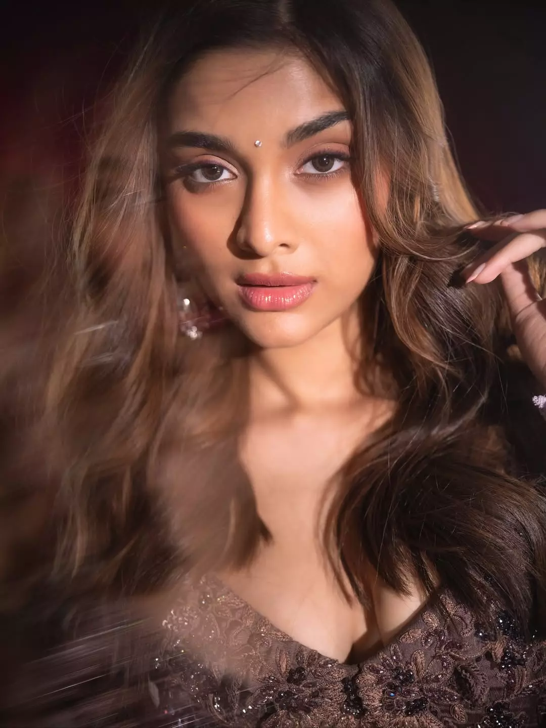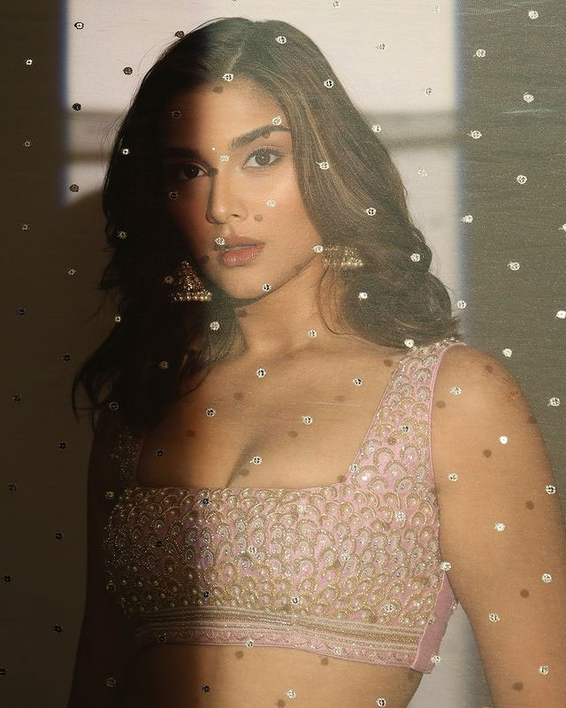 For the shoot, Saiee chose a delicate saree from Chamee and Palak, adorned with subtle embellishments and paired with a chic blouse that added a modern twist to the classic drape. Her styling was minimal yet sophisticated, allowing the pastel pink tones to pop against the golden-pink backdrop of the evening sky. Accented with understated jewelry, the look struck the perfect balance between grace and glamour.