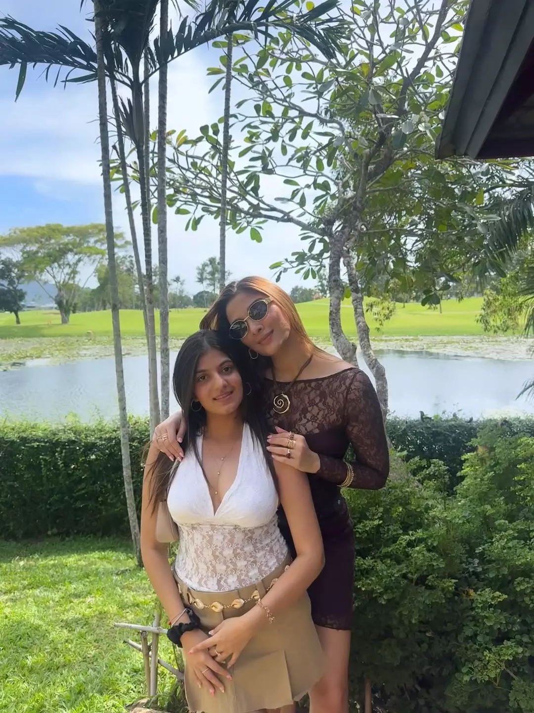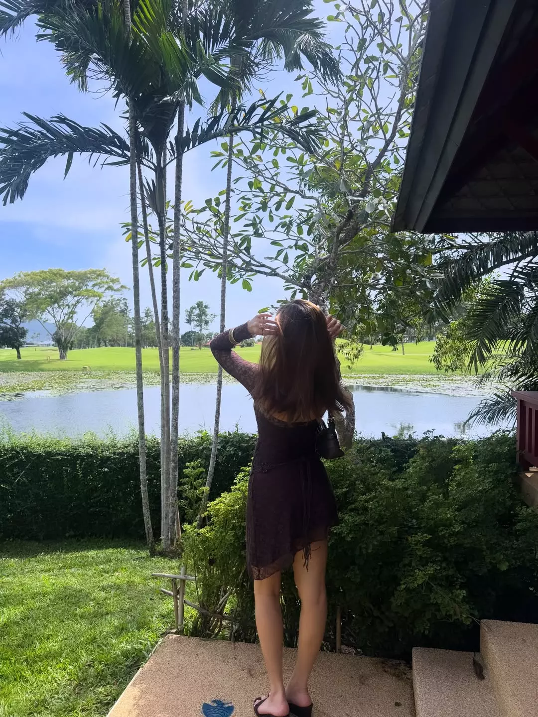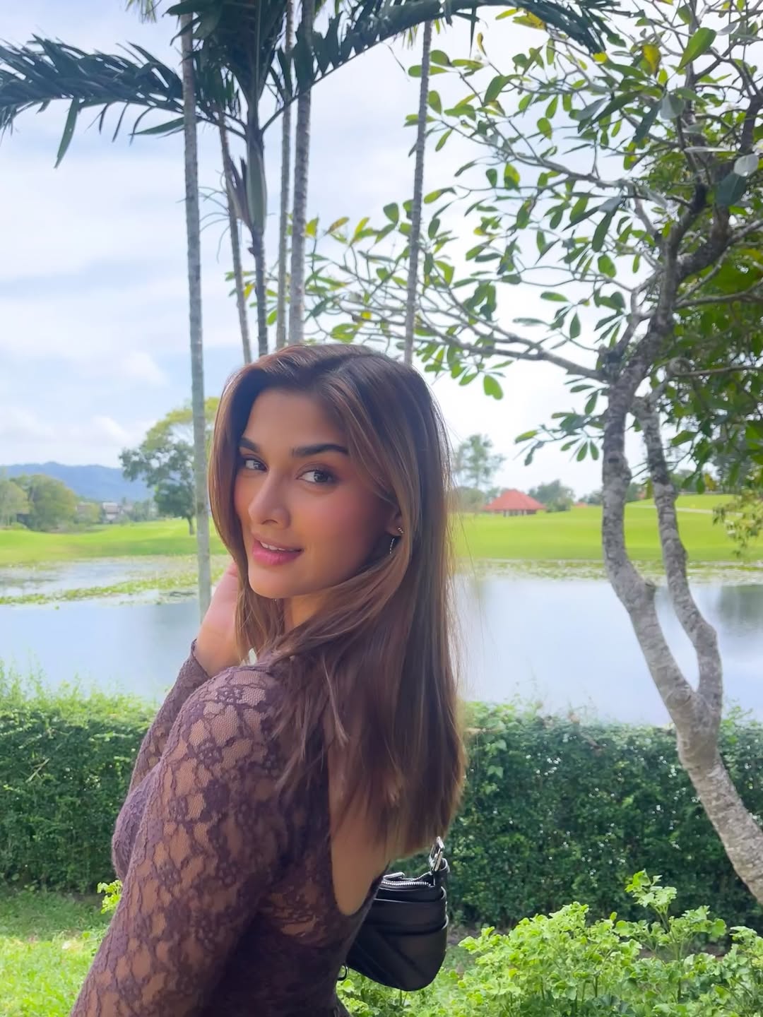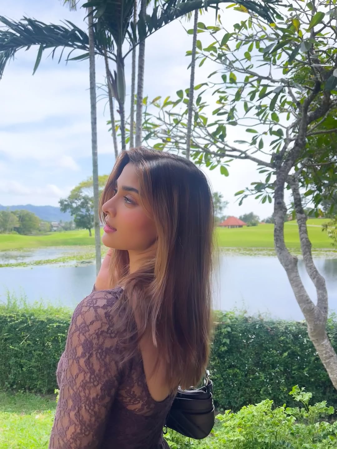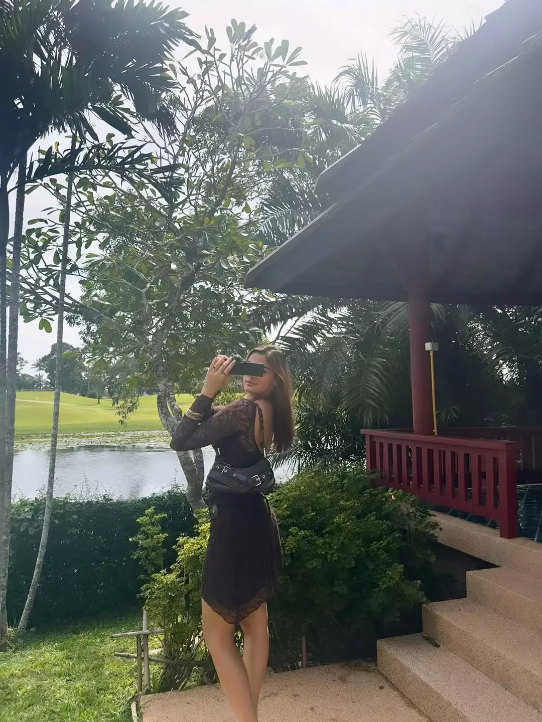 Captured mid-moment with a camera in hand, Saiee’s candid pose captures the fun, carefree spirit of the celebration. The lush green backdrop and striking red gazebo enhance the dreamy, vacation-vibe aesthetic.