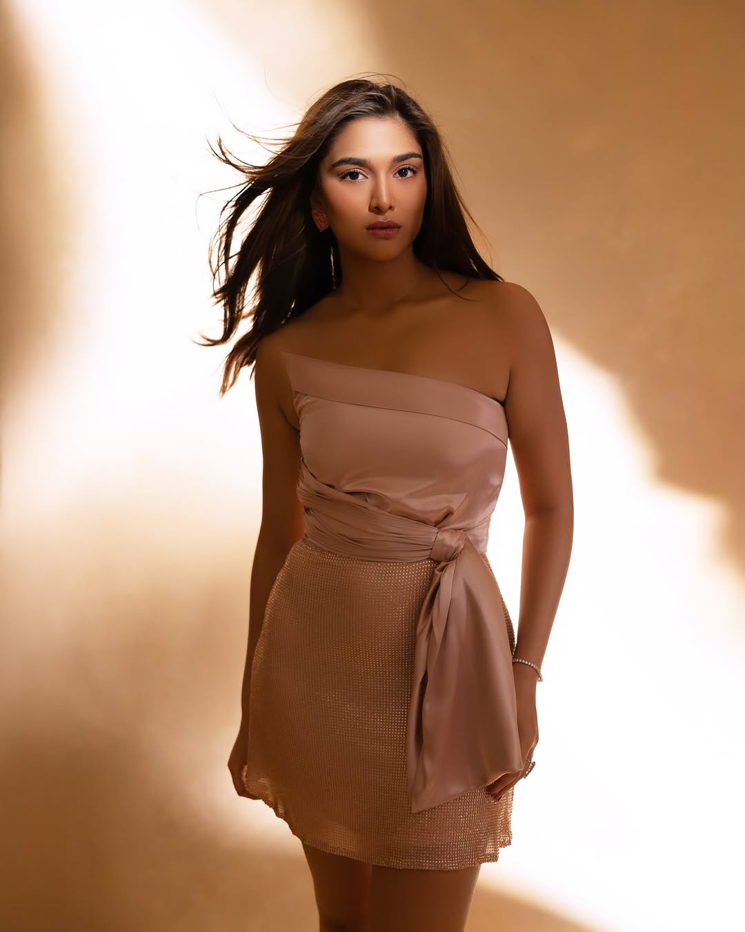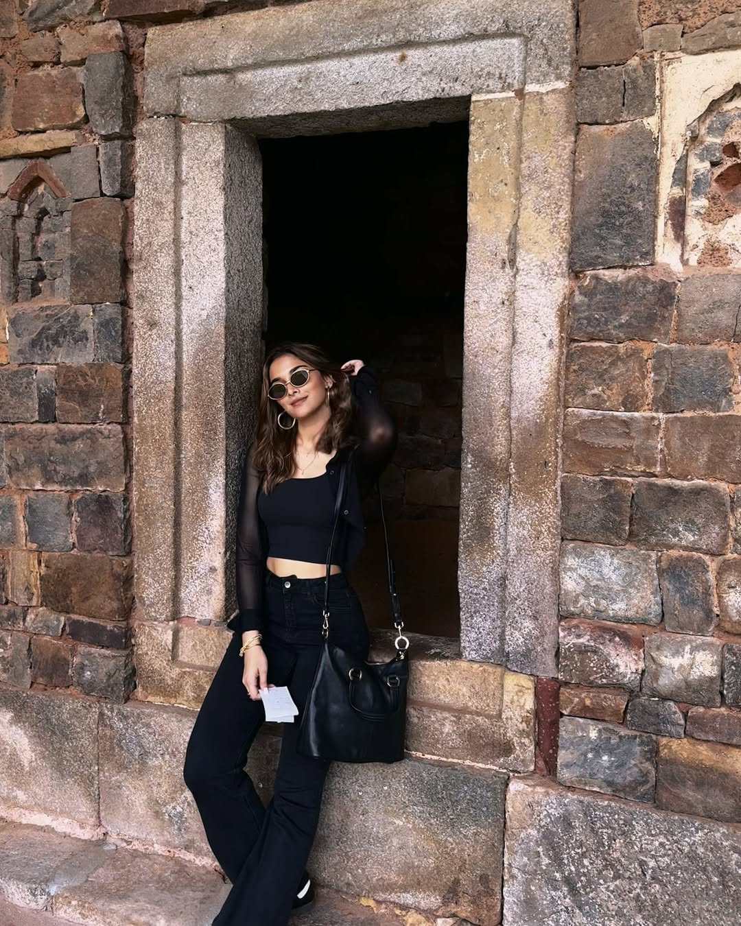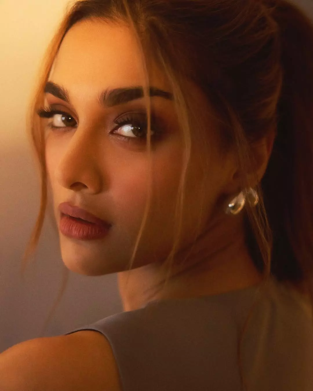Saiee Manjrekar recently shared a fresh post on Instagram. She posed confidently in a light grey zip-up dress. A black scarf-style cloth added contrast to her look. She styled her hair in a soft ponytail with loose strands.