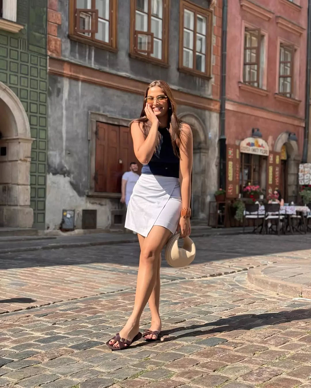Actress Saiee M Manjrekar recently shared a stunning Instagram post from her trip to Warsaw, Poland. She is dressed in a chic black top paired with a white wrap skirt and sandals. Saiee looked effortlessly stylish as she stood on a cobbled street with old European architecture in the background. Her caption, “war-saw the most beautiful city 🤎”, was a clever play on words showing both her love for travel and her fun personality.