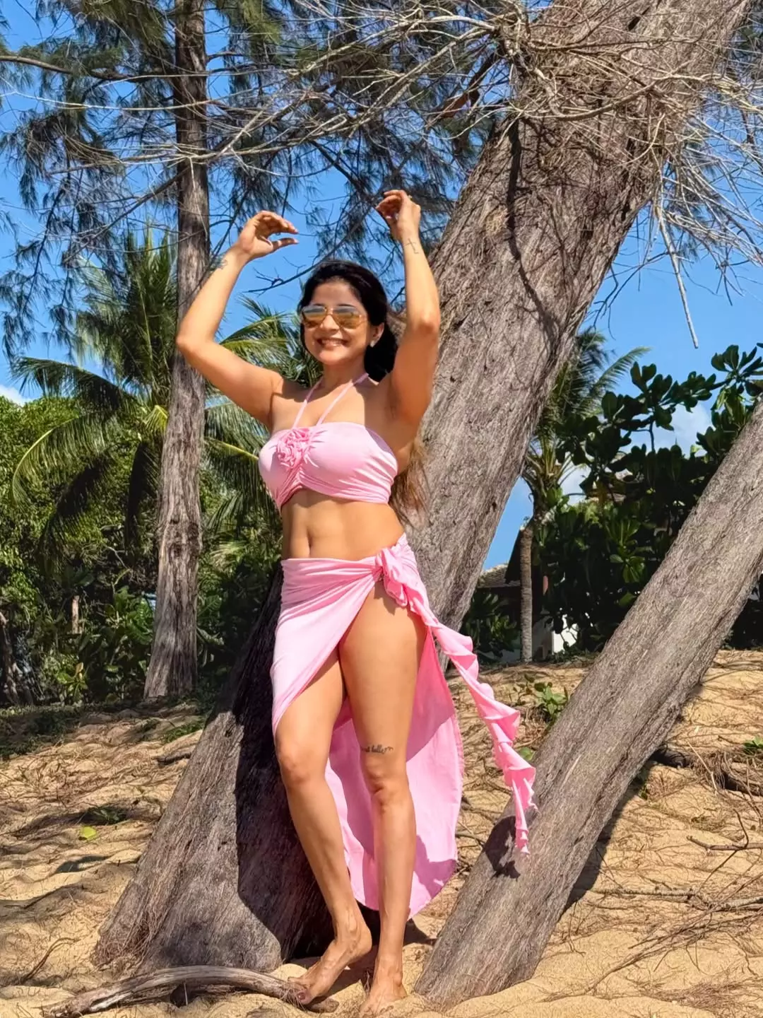 Sakshi Agarwal exudes relaxed confidence and vacation-ready elegance in a vibrant pink bikini set that mirrors her free-spirited sensibility. The halter-neck, wrap-style bikini top—popularly known as the “Island Goddess Over The Shoulder Wrap Top”—features a flattering sweetheart neckline and a thoughtfully draped wrap-front design, striking a perfect balance between softness and contemporary style. The look feels effortless yet intentional, celebrating comfort, strength, and individuality.