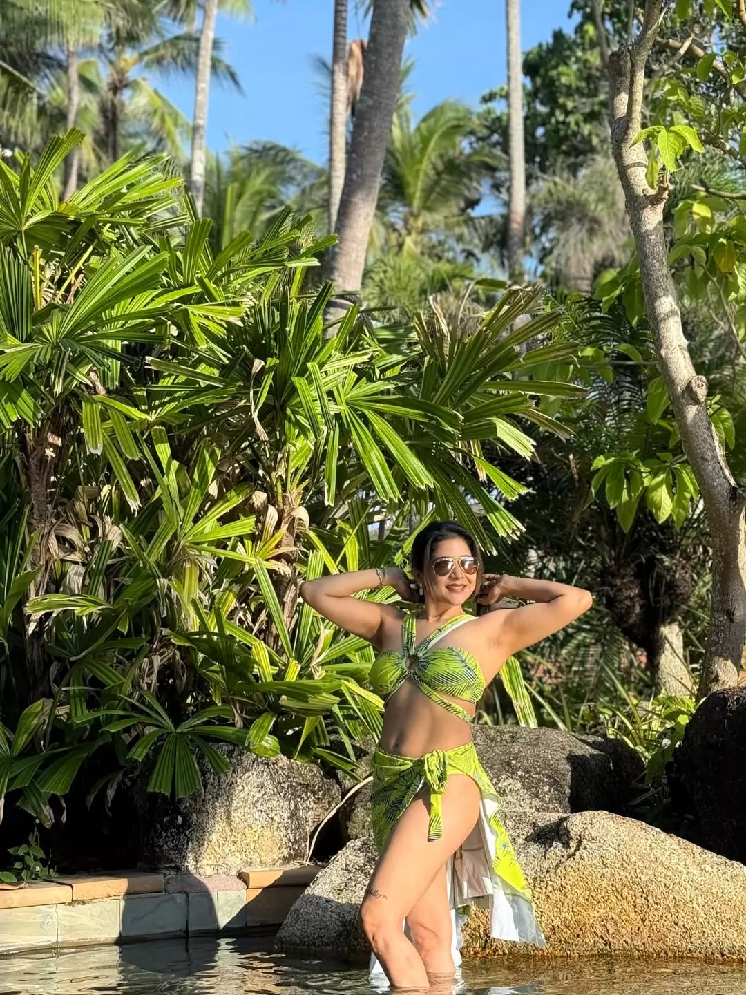 Against the tranquil backdrop of Phuket, Sakshi’s swimwear choice blends seamlessly with the tropical landscape while subtly highlighting her dedication to fitness and holistic well-being.