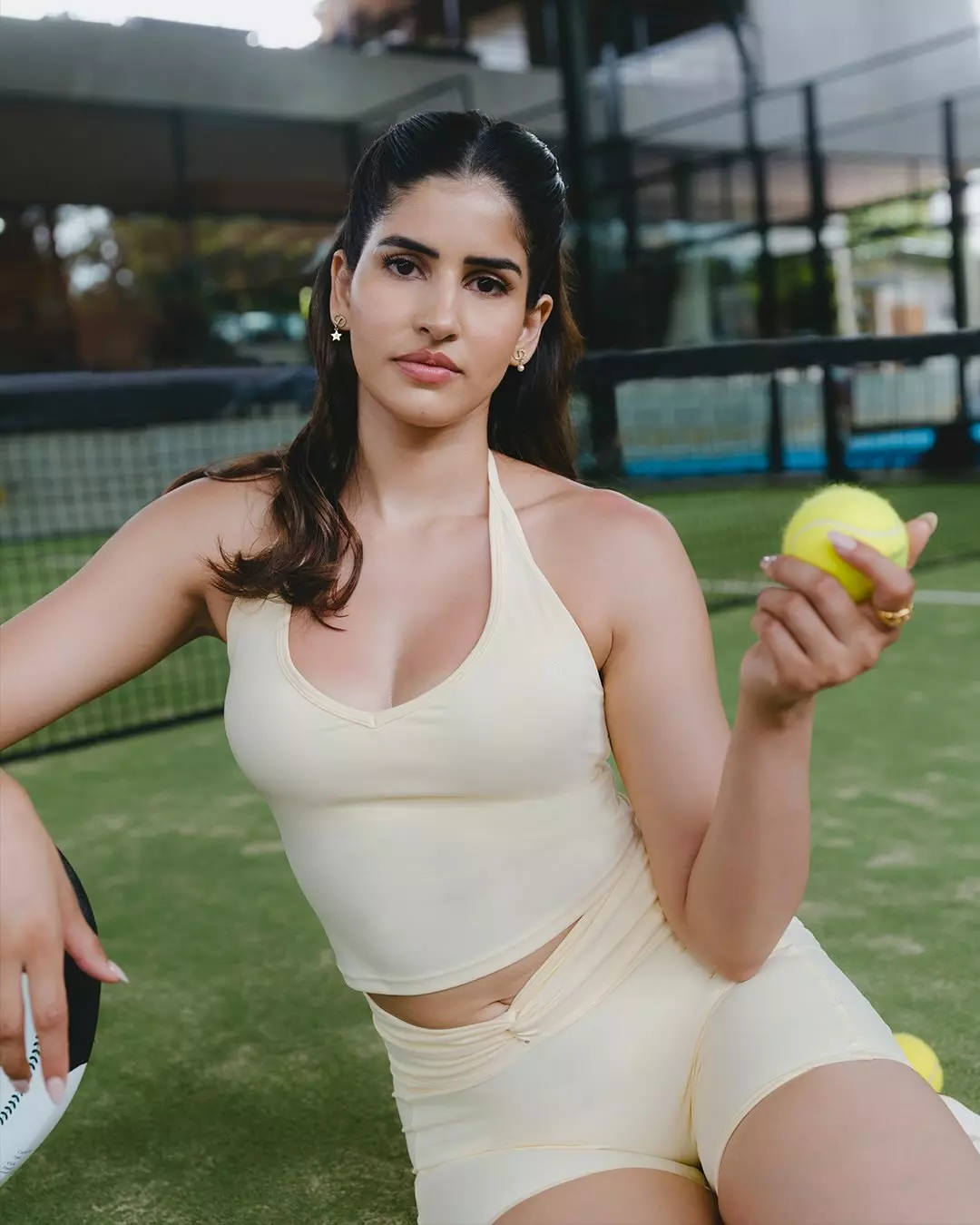 Actress Sakshi Malik recently shared both a stylish moment from her latest Instagram post and a serious side of her journey in the film industry. In the picture, Sakshi is seen posing confidently on a sports court, wearing a light-colored athletic dress and holding a tennis ball. The caption reads, “ELVN on and off the court.”