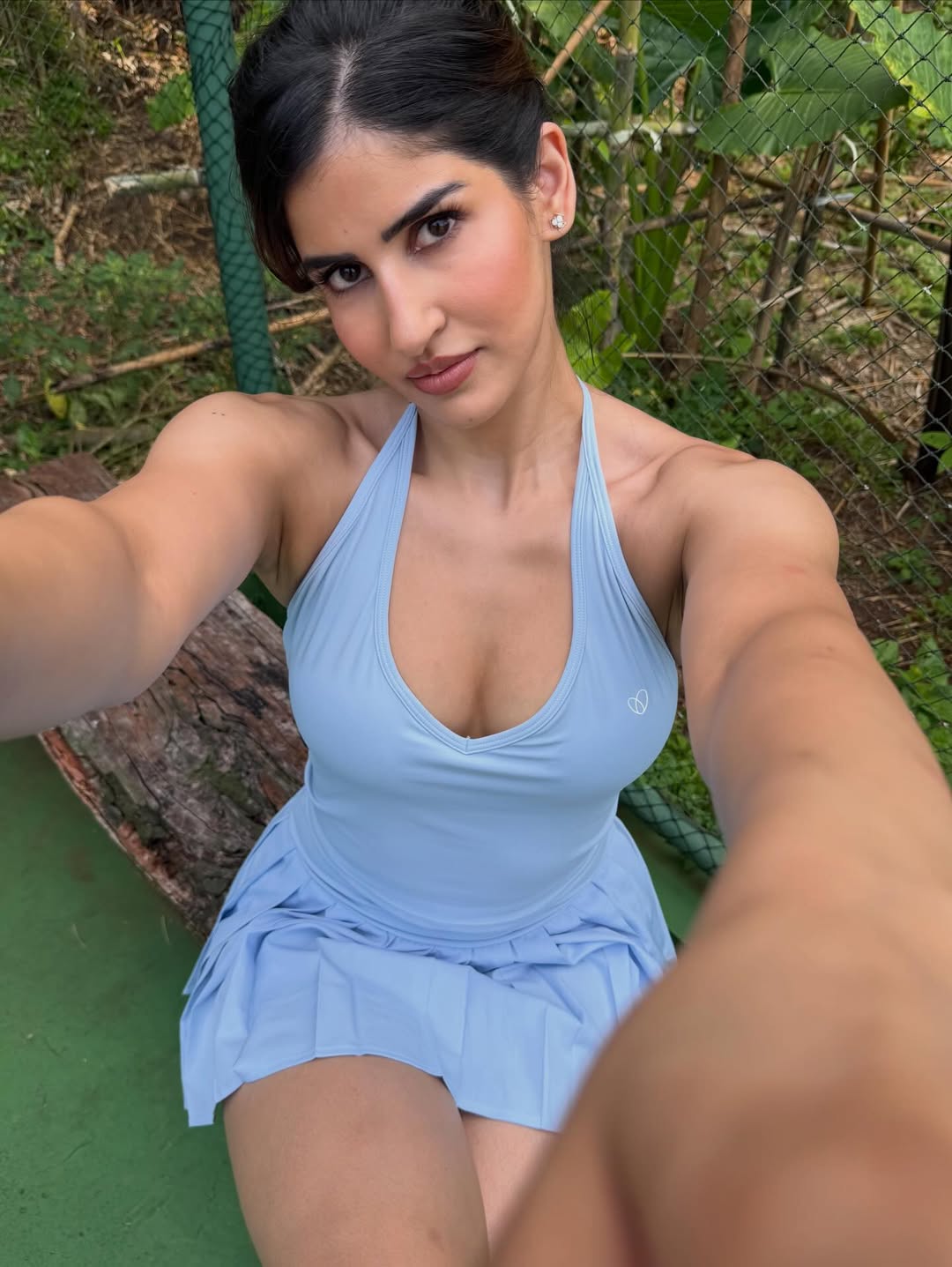 By: Tupaki Gallery Desk | 27 April 2026 11:19 PM ISTFitness influencer and actress Sakshi Malik is turning up the heat with her latest stylish post. In a series of confident snapshots, she rocks a sporty baby-blue halter top and pleated mini skirt, flaunting her toned physique while posing on the tennis court. One selfie captures her playful close-up, while the full shot shows her holding a racket with tennis balls scattered around – the perfect blend of glamour and sportiness.