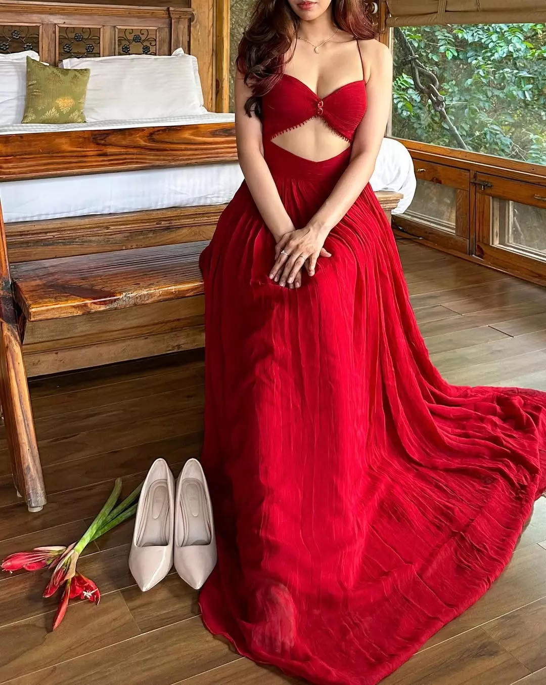 Actress and model Sakshi Malik once again mesmerizes her fans with a stunning photo dump, setting major style goals in a vibrant red outfit. Radiating charm and confidence, Sakshi is seen in a sultry red ensemble featuring a cutout design that beautifully accentuates her silhouette. The spaghetti straps and the delicate detailing at the bust add just the right amount of allure to her look, while the flowing skirt brings a touch of elegance and grace.