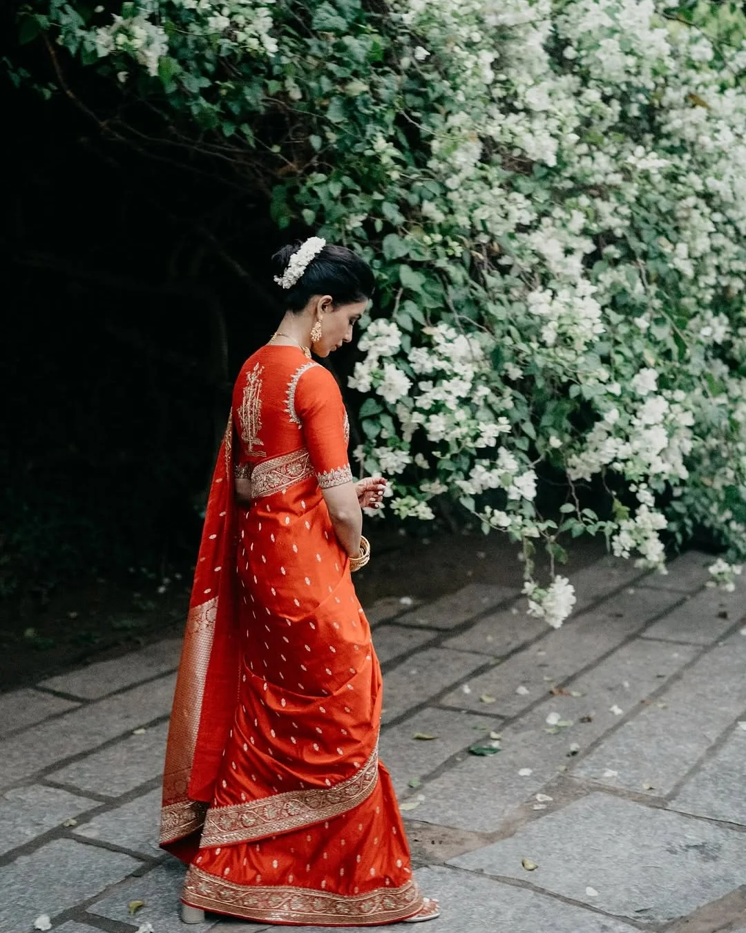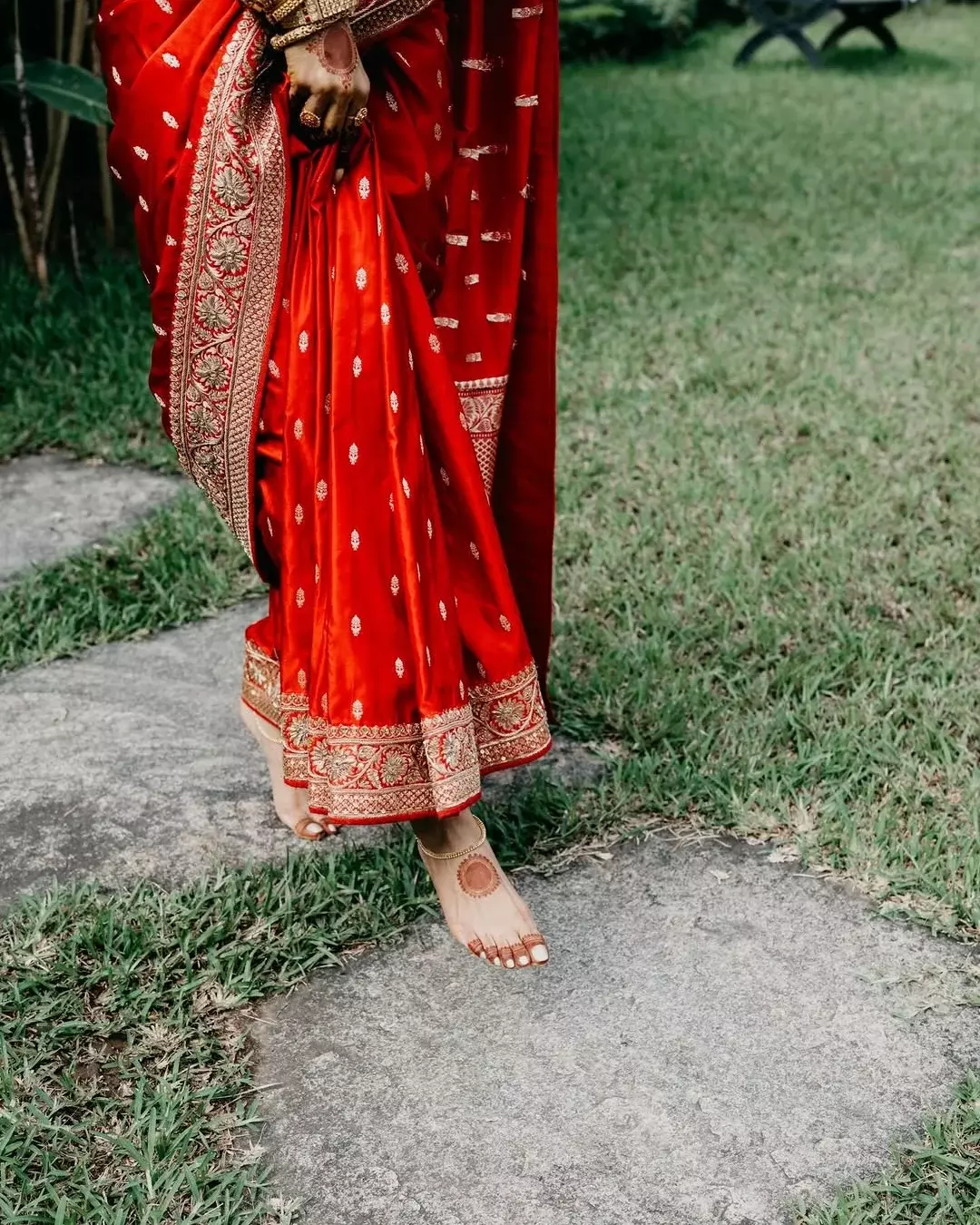 For her wedding, Samantha wore a custom-made red Banarasi saree created by designer Arpita Mehta. A day after Samantha posted her wedding pictures, Arpita shared new photos on Instagram by giving everyone a closer look at the saree’s fine work.