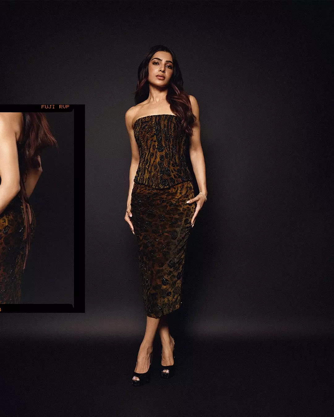 Samantha Ruth Prabhu shared a new post on Instagram. She wore a strapless printed dress with a fitted design. She completed the look with jewels by Mahesh Notandass and pumps by Christian Louboutin. She wrote in her caption, “About last night @streamingacademy.in 🖤 #CitadelHoneyBunny.” Her hair was styled by Daksh Nidhi. Makeup was done by Avni Rambhia. Styling was managed by Dollaypop with support from Iss Medev and Parisa Jnani. She wore a piece from That Antique Piece. The frame was captured by Distorted Memories.