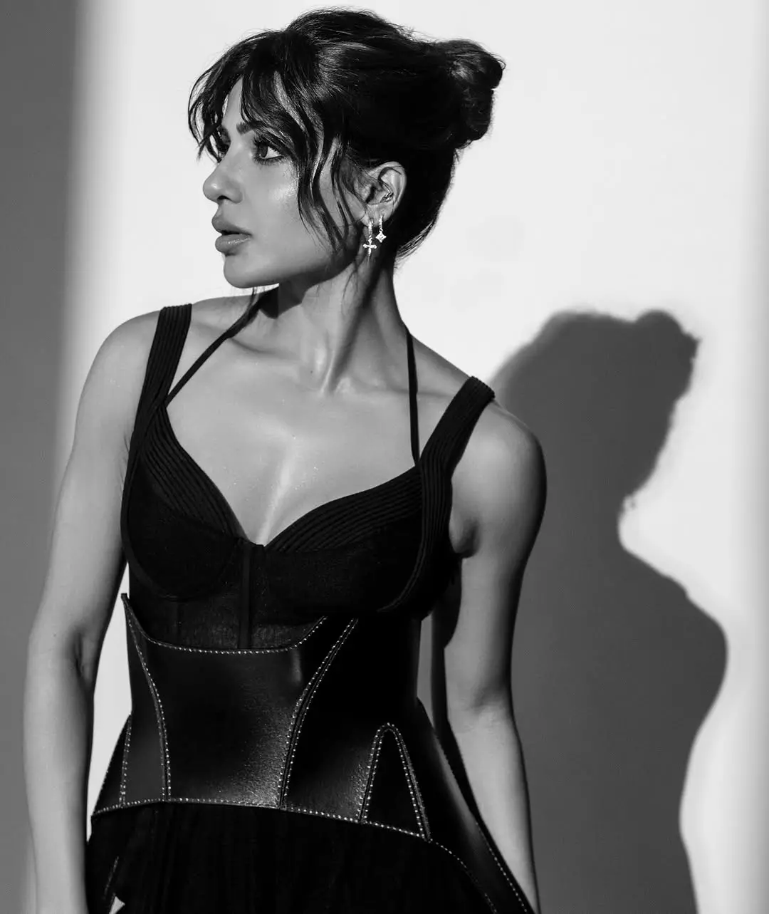 Her glam was perfectly executed by Avni Rambhia (@avnirambhia), while her voluminous, soft curls were styled by Nidhi (@dakshhnidhi), enhancing her overall sultry look. The photograph was shot by @distortedmemories and Anusha Prabhu (@anushaprabhu) capturing Samantha in a powerful and alluring pose.