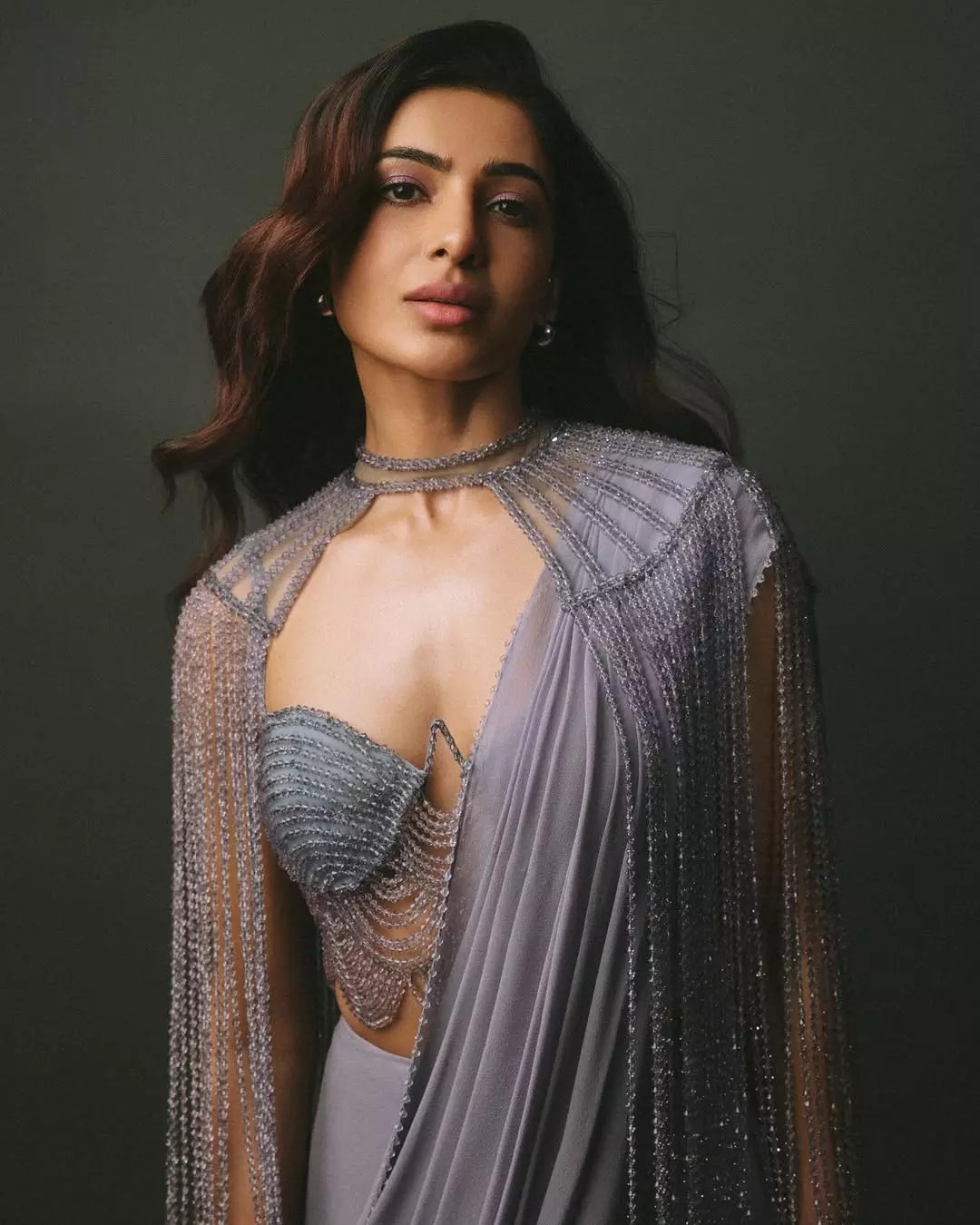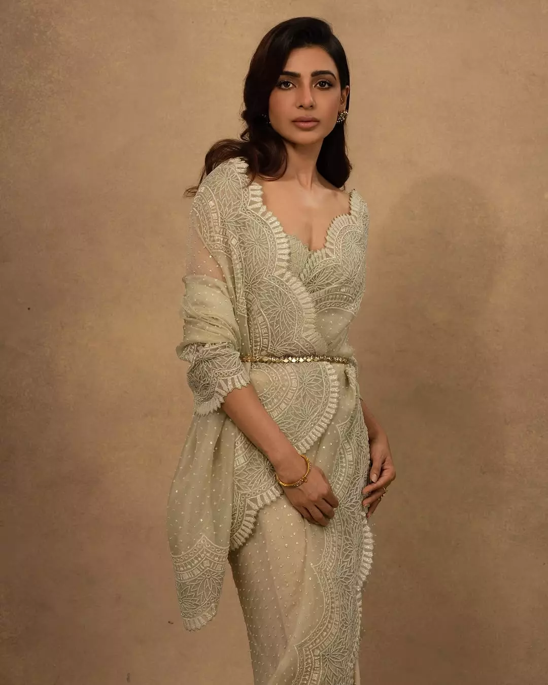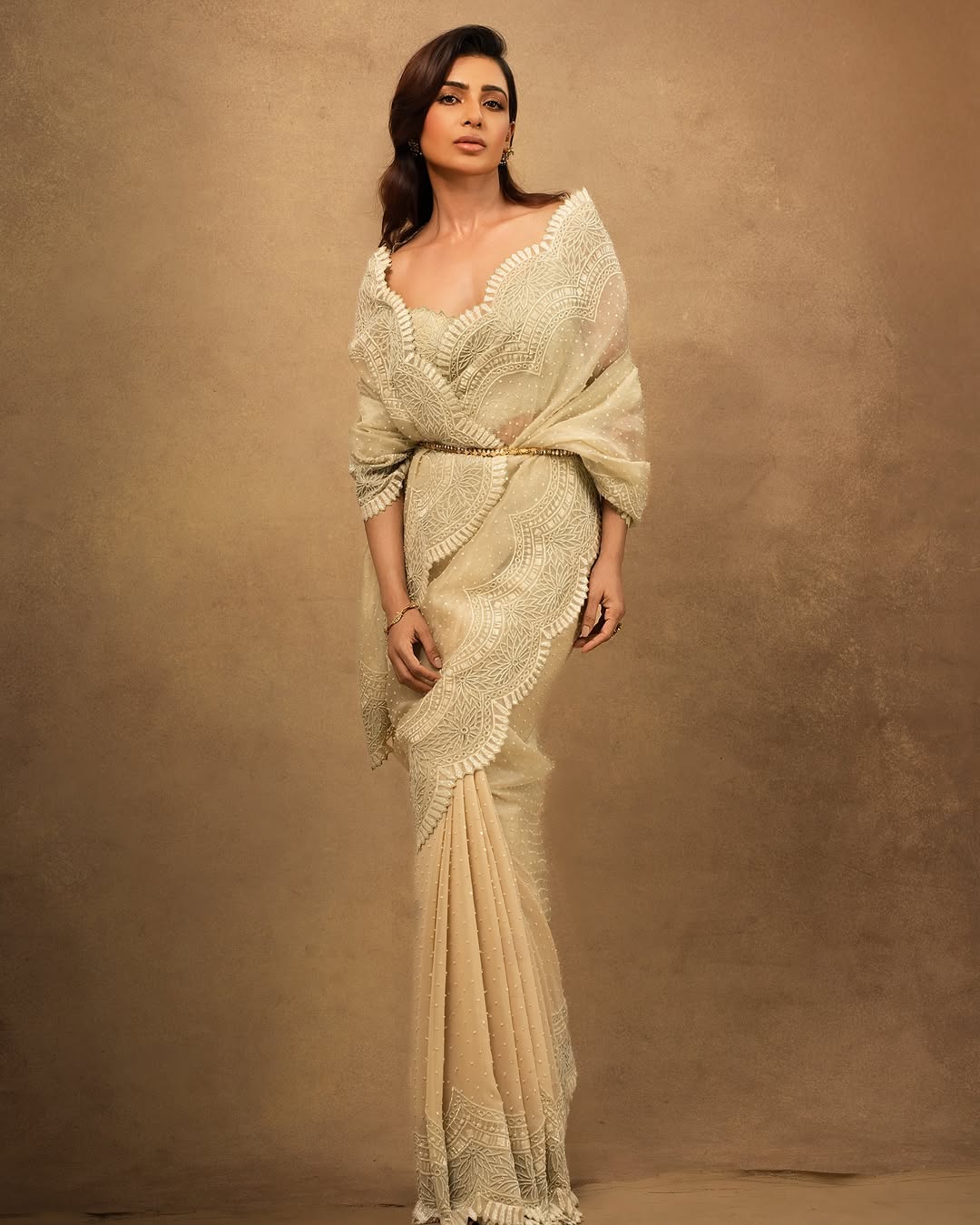 Samantha Ruth Prabhu looked graceful in a beautiful saree designed by Kresha Bajaj. Her look was completed with elegant jewels from Dhora India, styled by Prayag Menon and the style team led by Yamy Chavan. Her makeup was perfectly done by Anigha Jain, and her hair was styled by Daksh Nidhi. The dreamy moment was captured by photographer Maran.