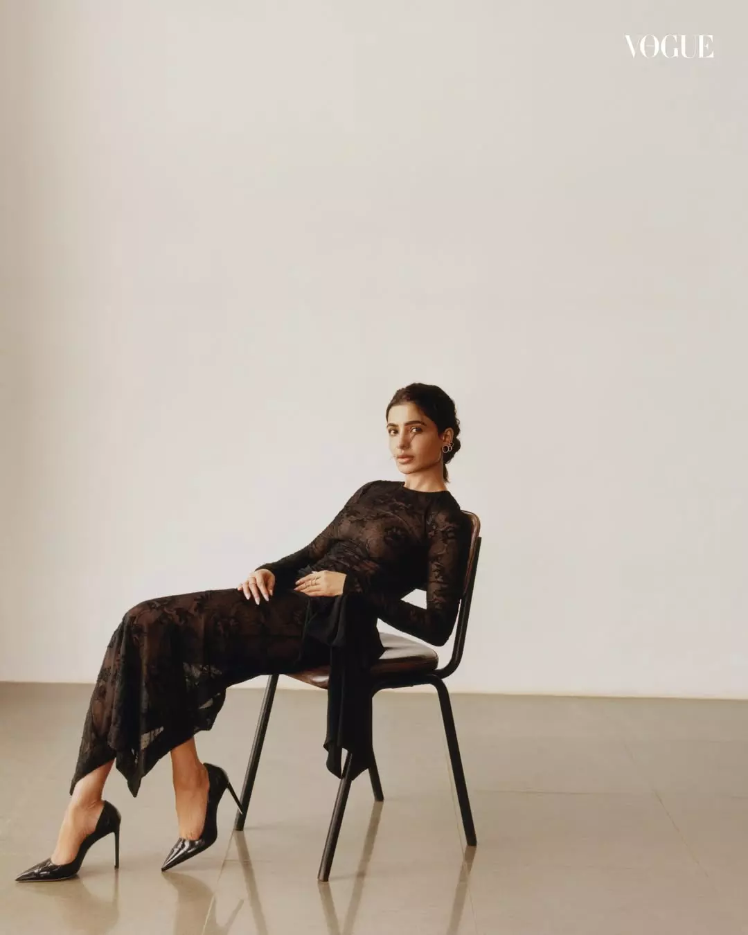 The creative team behind this Vogue India feature includes photographer Bikramjit Bose, stylist Devanshi Tuli, and writer Sadaf Shaikh. Hair styling was done by Daksh Nidhi, with support from The Artists Project. Makeup was handled by Avni Rambhia, while production was managed by Imran Khatri Productions. The fashion details include a lace dress by Alessandra Rich, jewelry from Studio Renn and Raf, and footwear from Jimmy Choo. Each element added elegance without taking attention away from Samantha’s expressions.