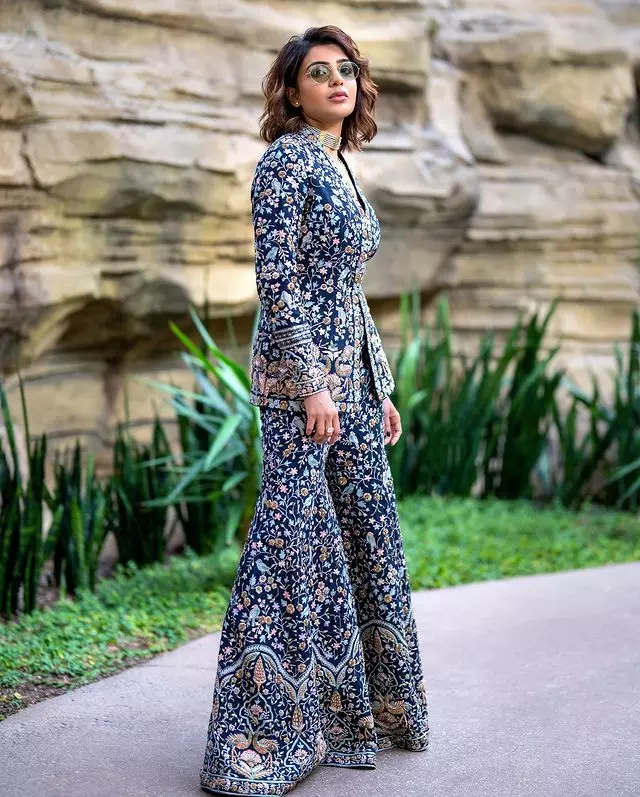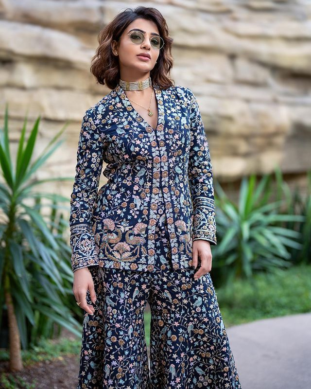 Recently, Samantha treated her fans to a visual delight as she took to Instagram to share glamorous pictures of herself. In these captivating images, she was seen wearing a royal blue embellished outfit that exuded regal charm. The attire was a perfect blend of tradition and modernity, showcasing intricate embroidery and a contemporary silhouette. Samantha's outfit showcased a deep royal blue hue that accentuated her elegance and beauty.