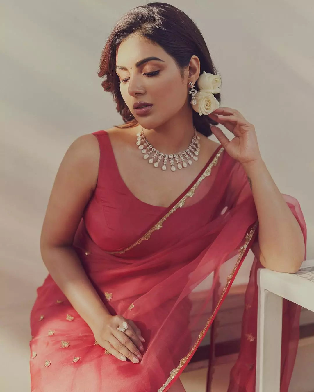Styled by @shruthimanjari and assisted by @niha-_-_varma, the actress wore elegant jewellery by @vegajewellers. The flawless makeup by @anighajain and hair done by @krishnakami complemented her look beautifully. The saree was draped perfectly by @madhusri9999 while the moment was captured by @tejasnerurkarr.