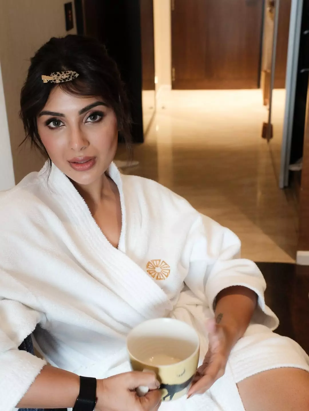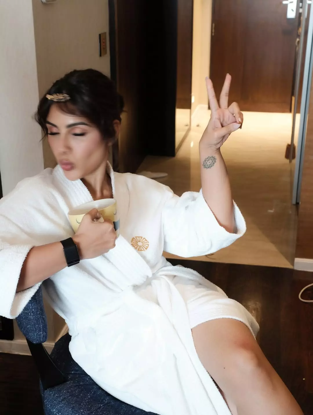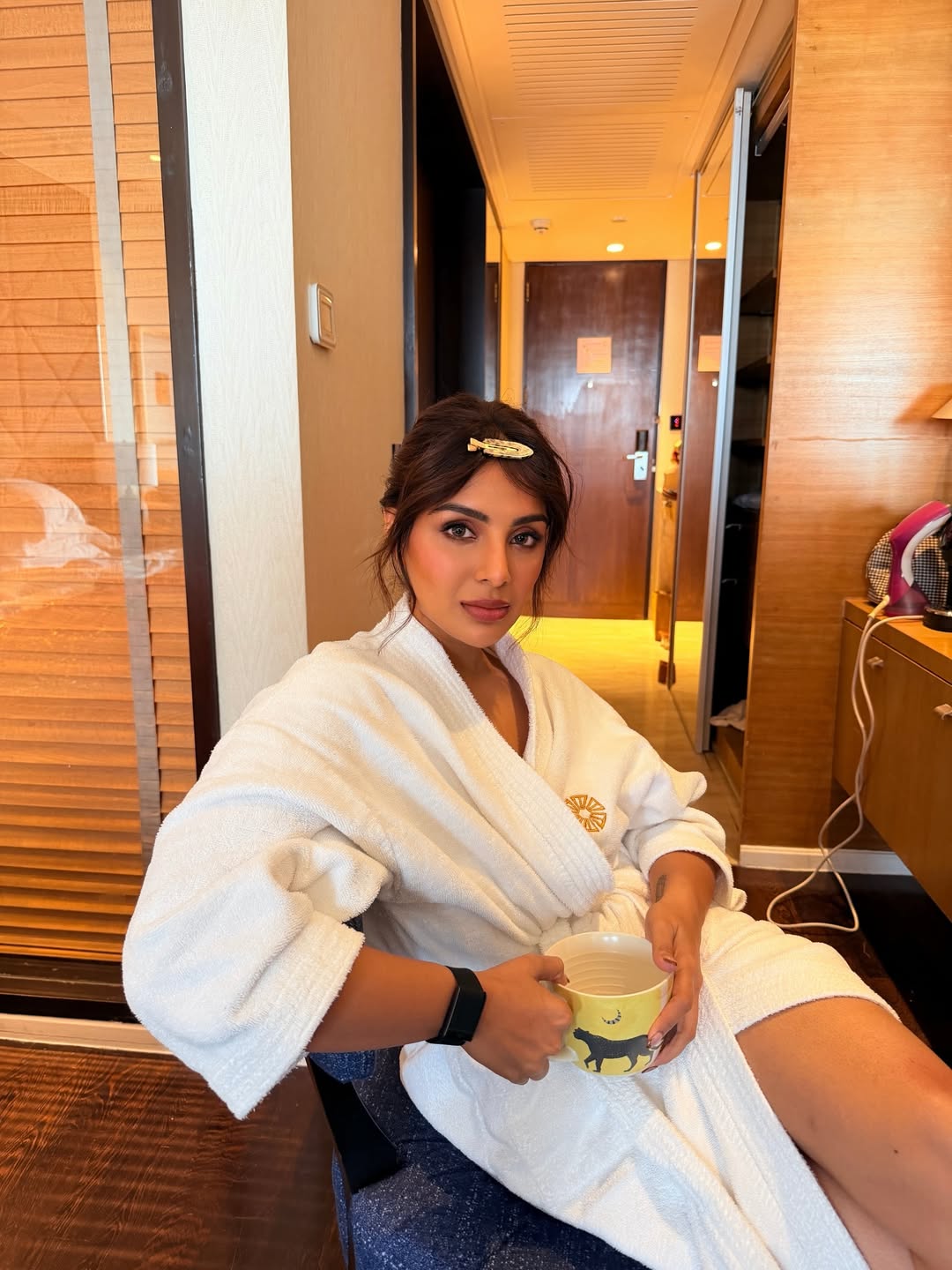In the shared photo, she exudes effortless elegance, lounging in a cozy white robe by a stunning high-rise window overlooking a scenic coastal bridge