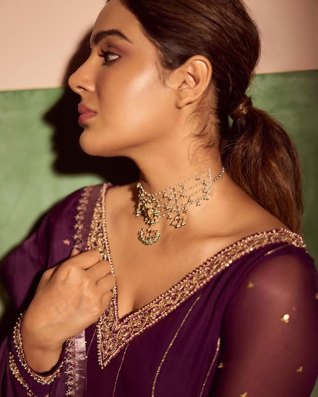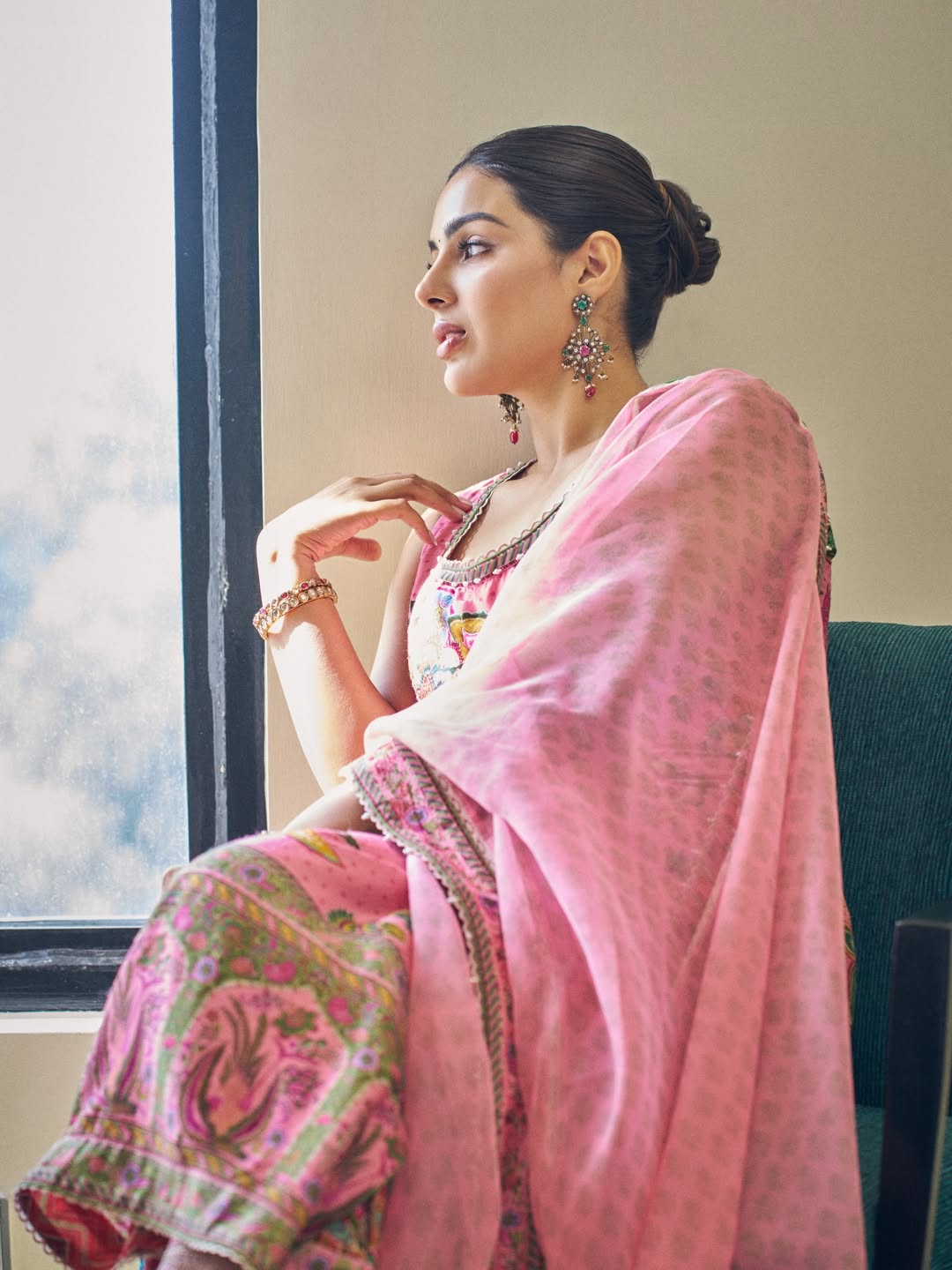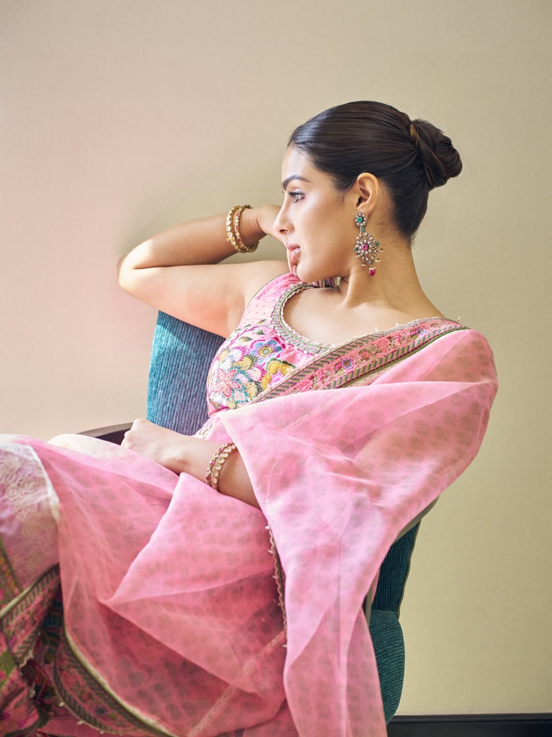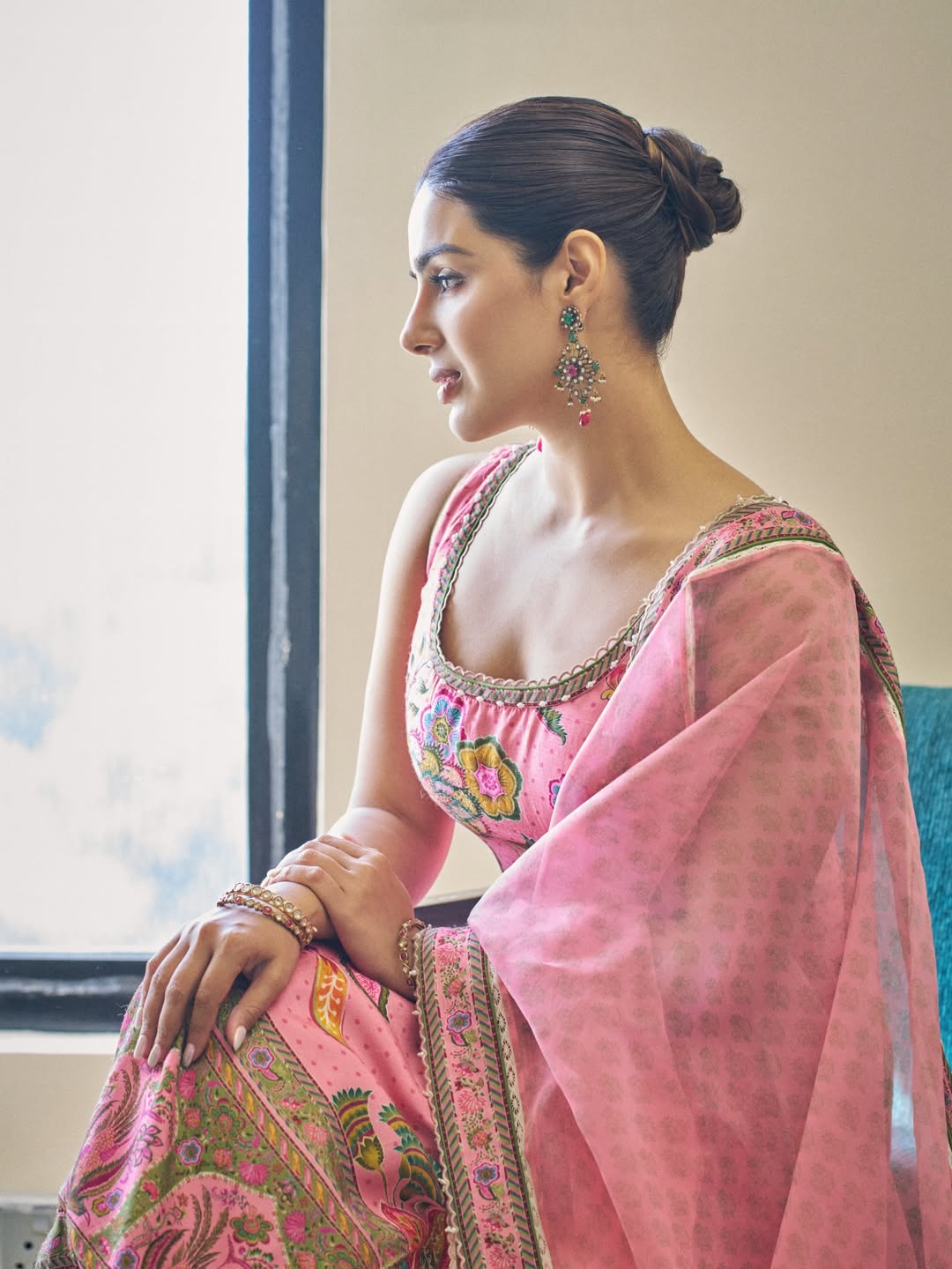 In this stunning photoshoot, she exudes poise in a vibrant pink floral ensemble from @toraniofficial, paired with exquisite jewellery from @shriparamanijewels.