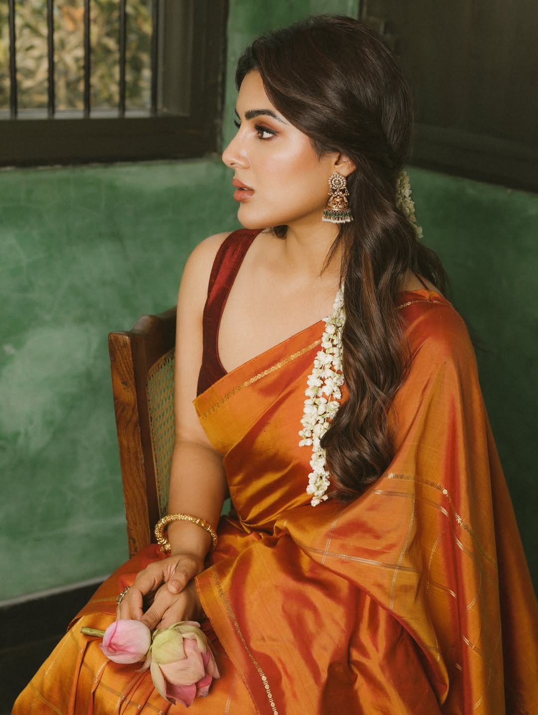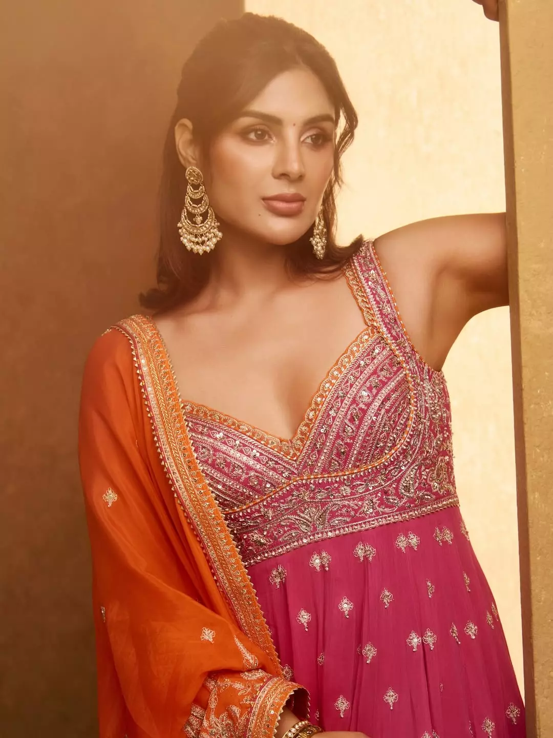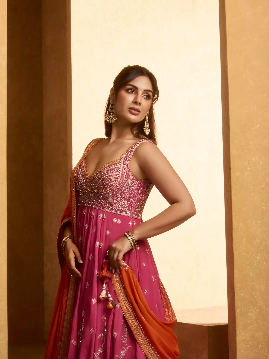 Stunning in a vibrant magenta and orange lehenga from @toraniofficial, paired with exquisite jewellery by @shriparamanijewels, South Indian actress Samyuktha Menon (also known as Samyuktha) looks radiant in this glamorous photoshoot.