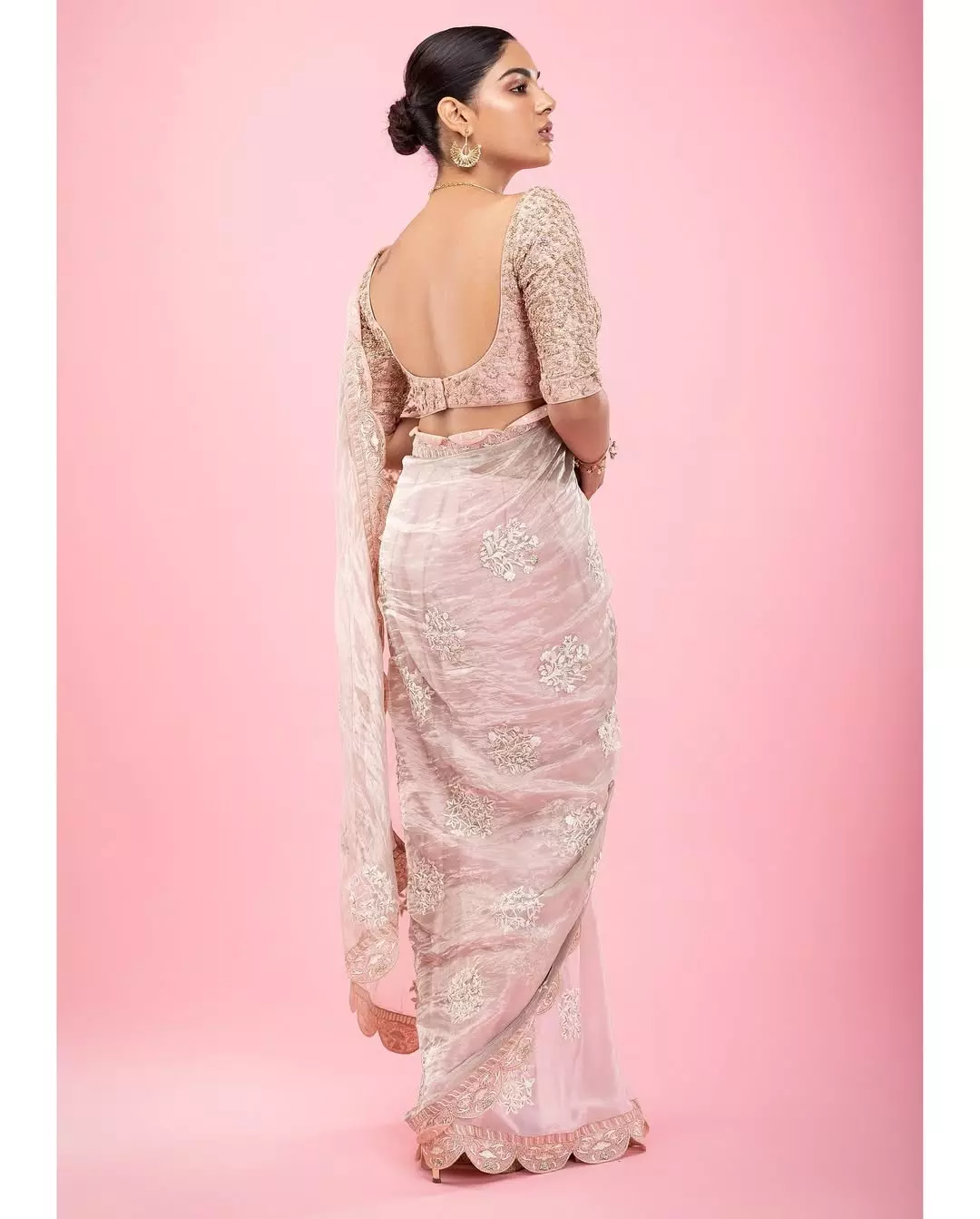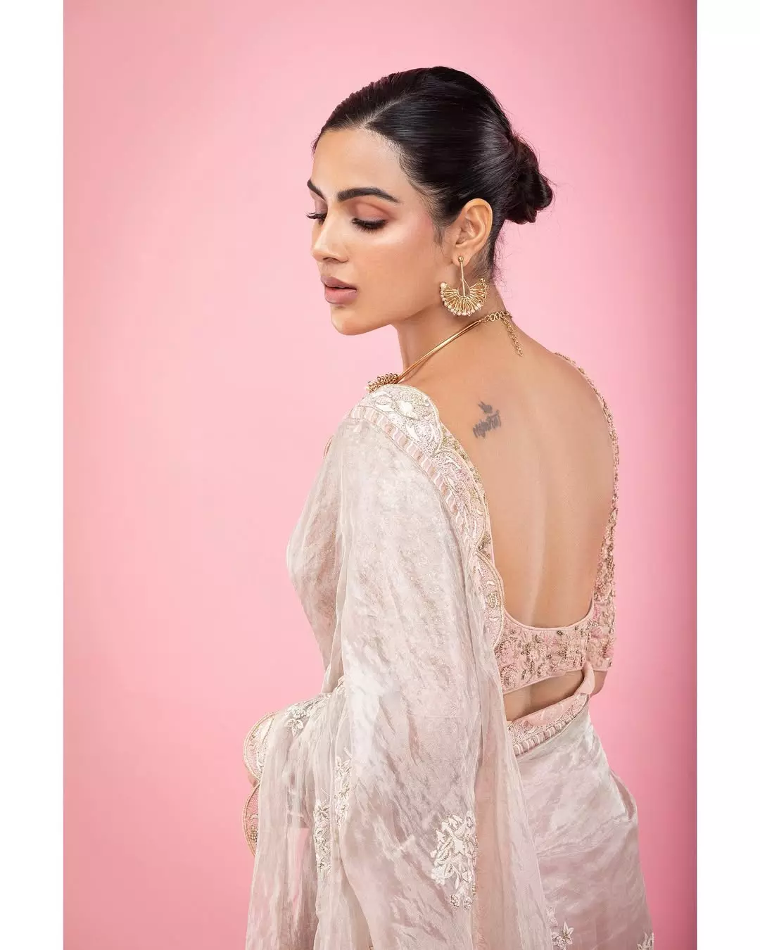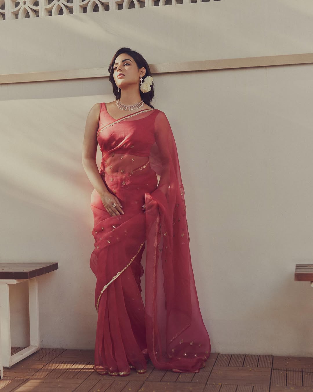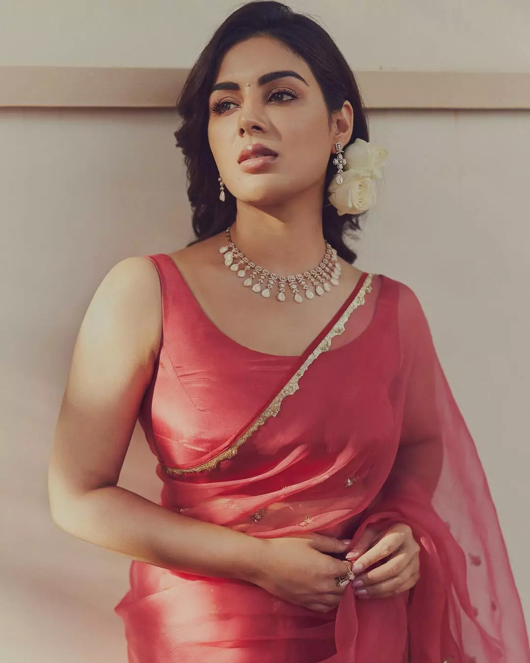 Samyuktha Menon radiates regal elegance in this stunning portrait, draped in a vibrant pink saree that perfectly complements her confident charm. The actress pairs the saree with an intricately embroidered blouse, adding a touch of timeless artistry to her modern yet traditional look. Her statement necklace, adorned with rich gemstones, elevates the ensemble into a true celebration of Indian heritage and craftsmanship. With softly styled hair and flawlessly blended makeup, Samyuktha embodies a rare combination of grace, poise, and contemporary allure.