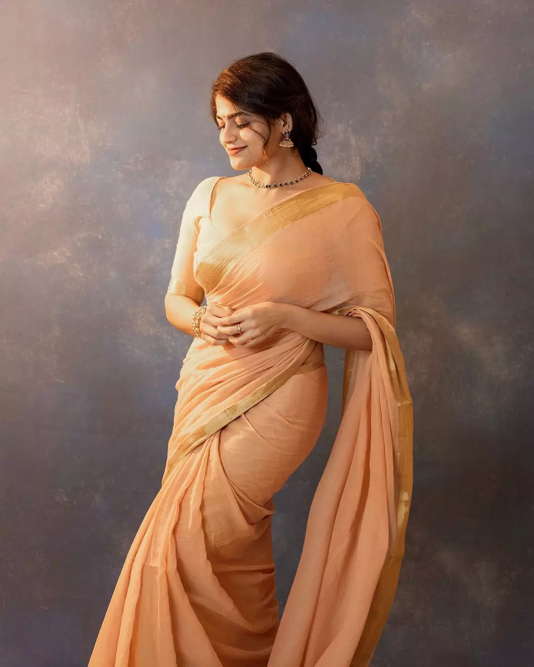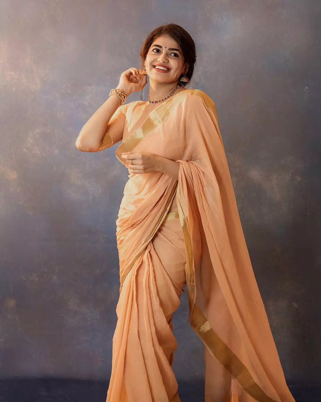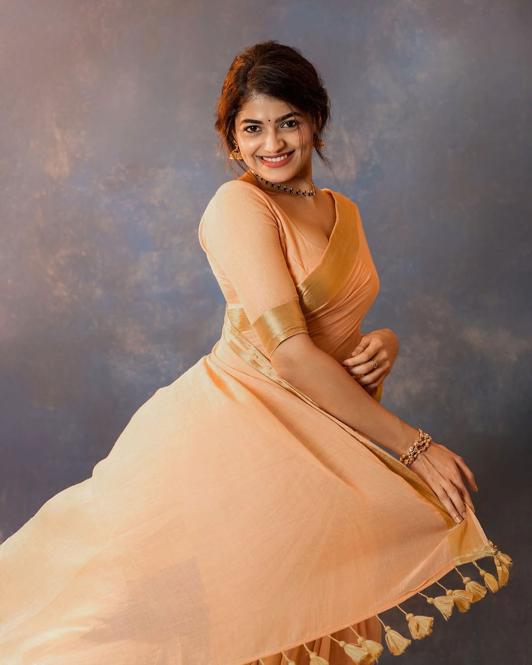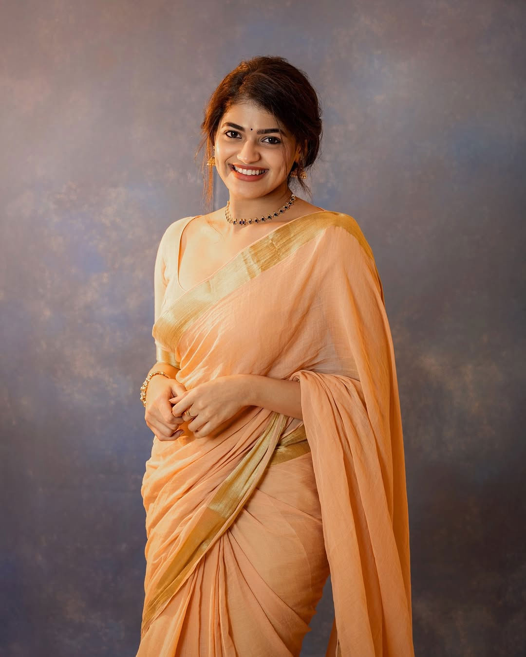 By: Priya Chowdhary Nuthalapti | 21 Aug 2025 9:48 AM ISTSangeerthana Vipin shared a new picture on Instagram. She looked happy and graceful in a light peach saree. She captioned the post with the words “Glowing ✨❤️”. Her bright smile made the picture warm and charming.
