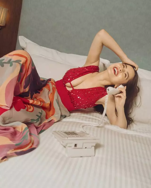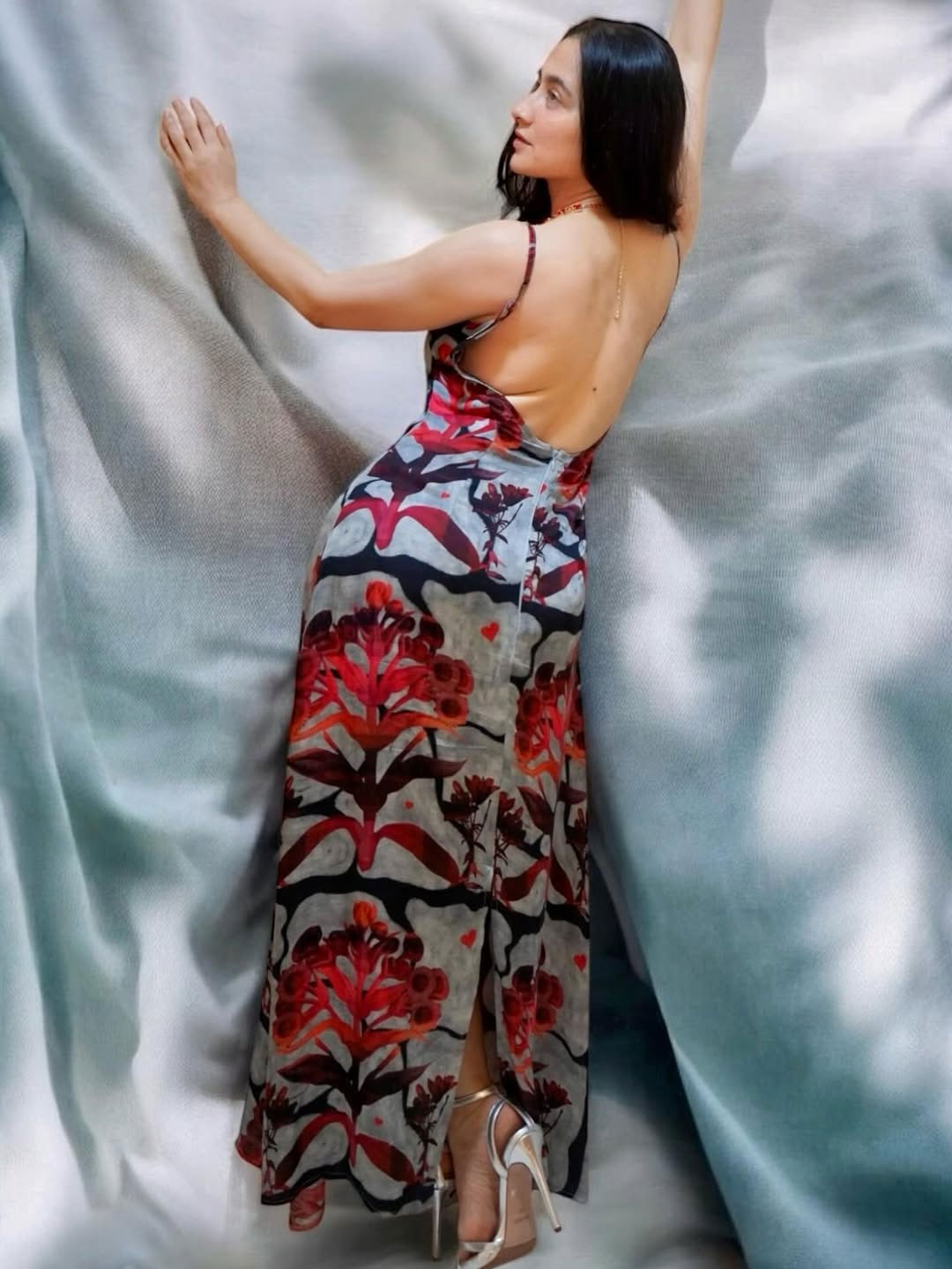 She is seen wearing a floral dress with red and black patterns. The dress is from @ekastories.store and styled by @roshni0819.