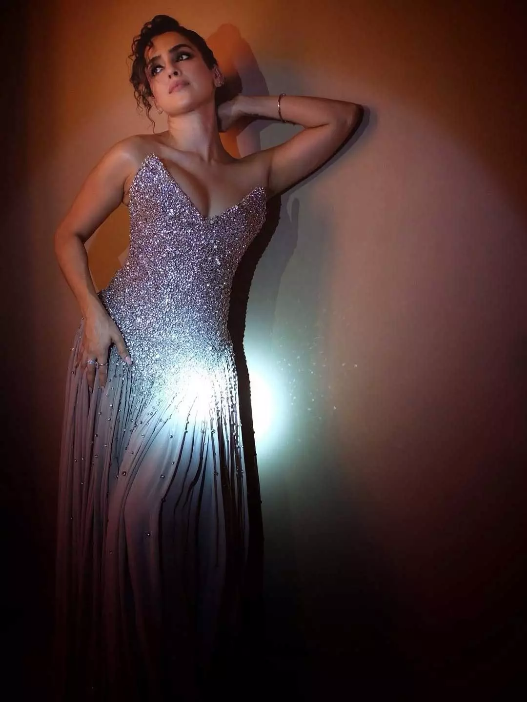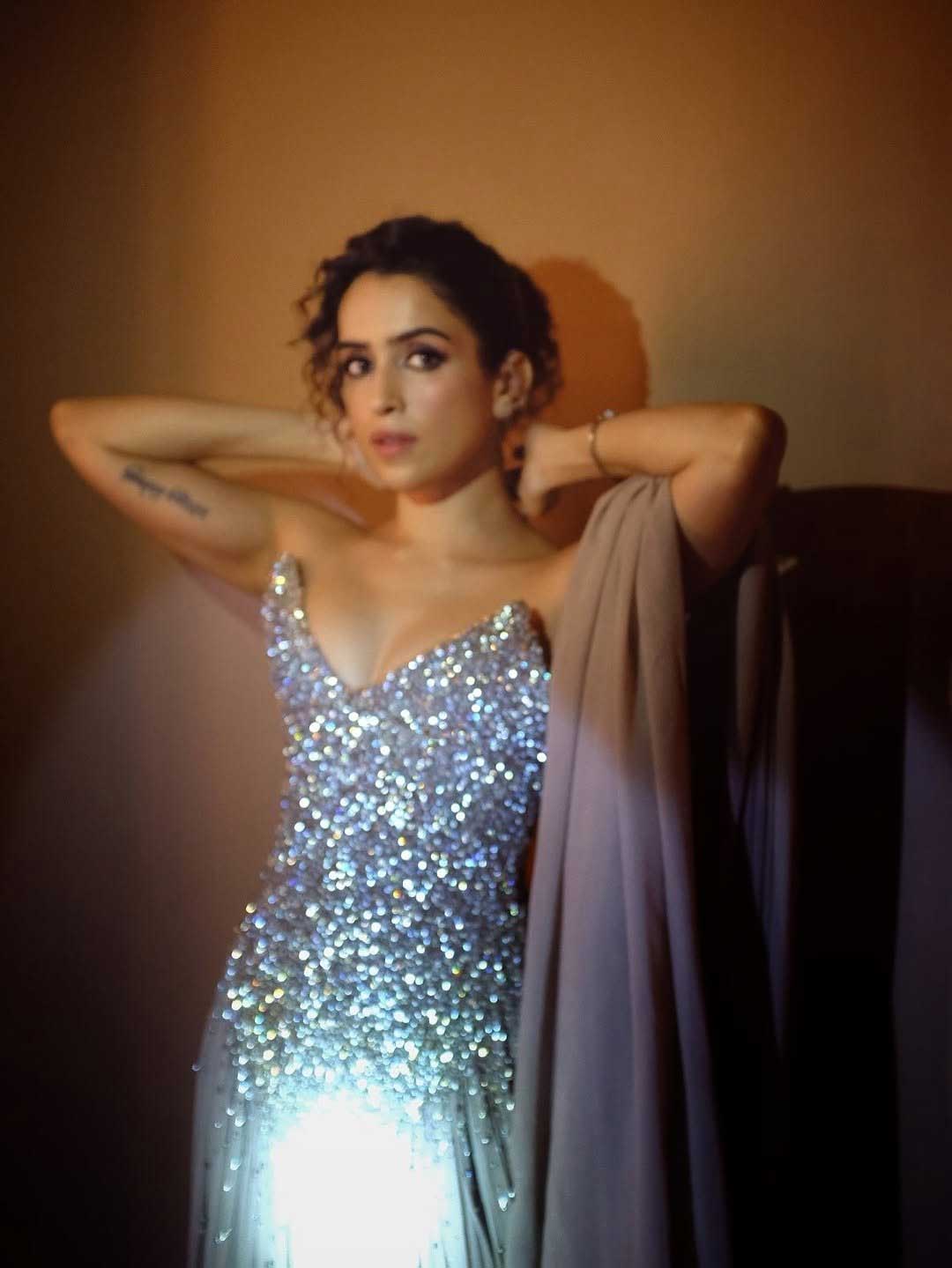 Bathed in soft light, she stands poised like a star born of stardust. Sanya Malhotra doesn�t just wear a gown she transforms it into art. Every sparkle on her dress is a reflection of her quiet fire, the brilliance she carries within. Eyes that dream, hands that speak confidence she is elegance in motion.