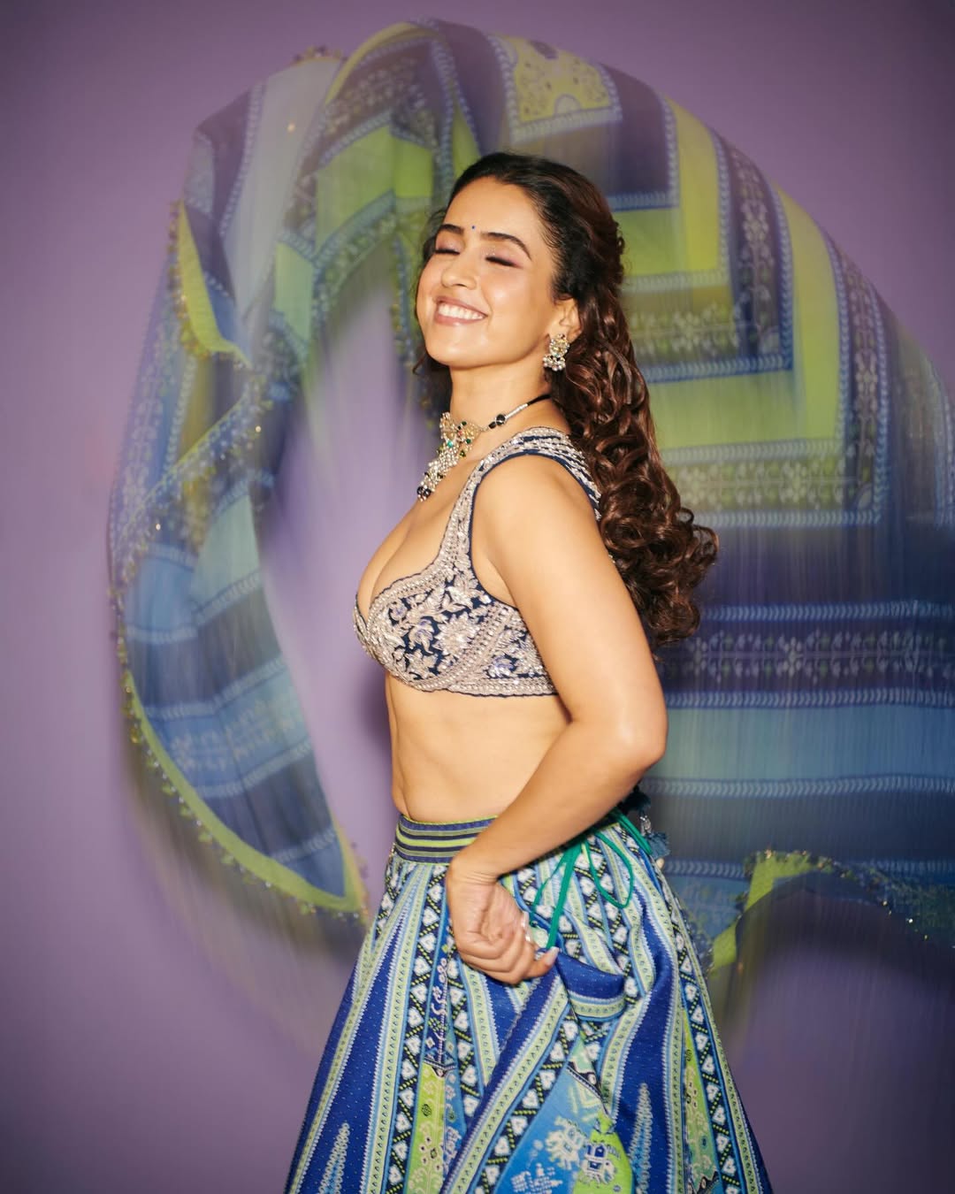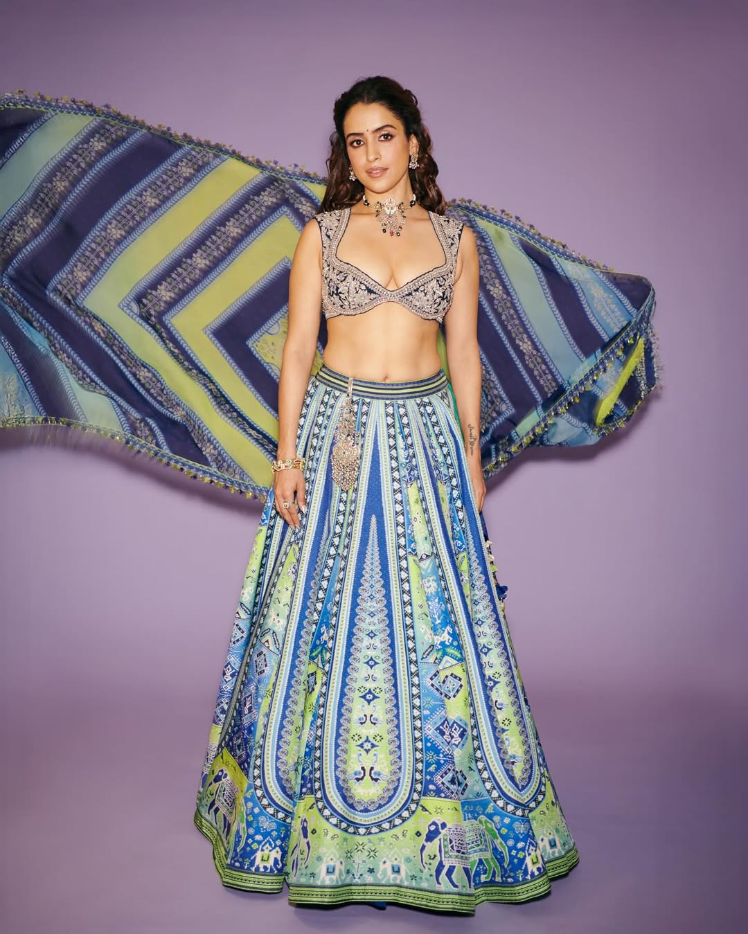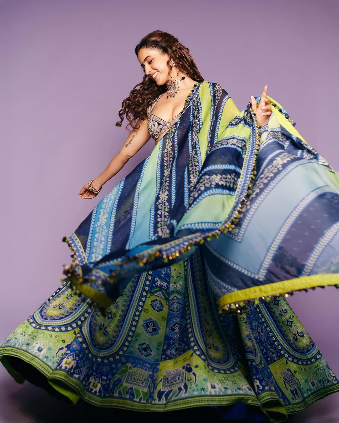 She wore a blue lehenga from Toraniofficial, paired with a bold blue-toned necklace from Samarpan Jewellery and extra touches from Curio Cottage Jewelry. The outfit felt celebratory but not overdone, a balance that matched the season. Styled by Stacey Cardoz with support from Nishthaa Agarwal’s team, the look came together neatly. Hair by Janvi’s team stayed soft and flowing, while Natasha Mathias gave her a glowing finish with makeup that stayed fresh under the camera lights.