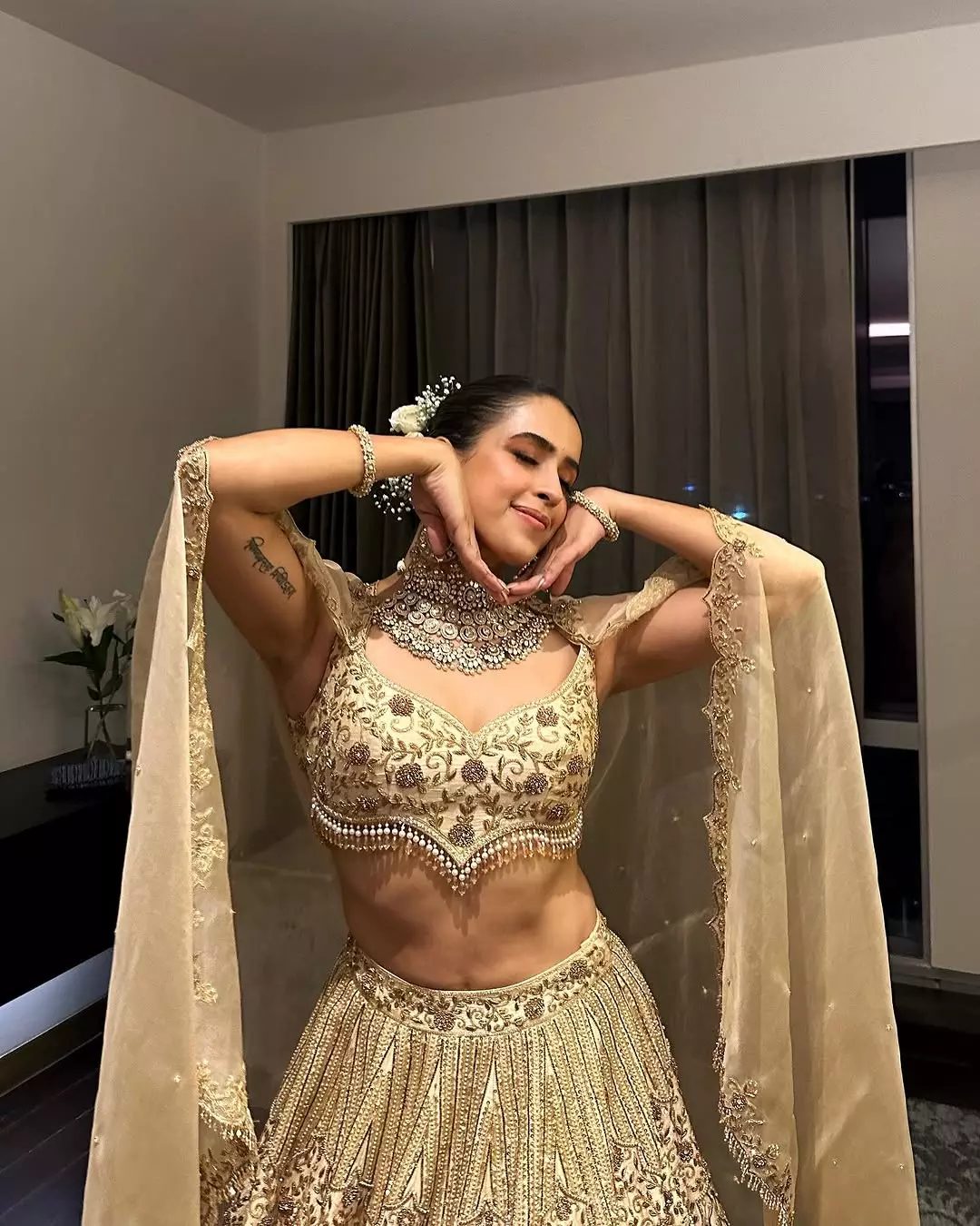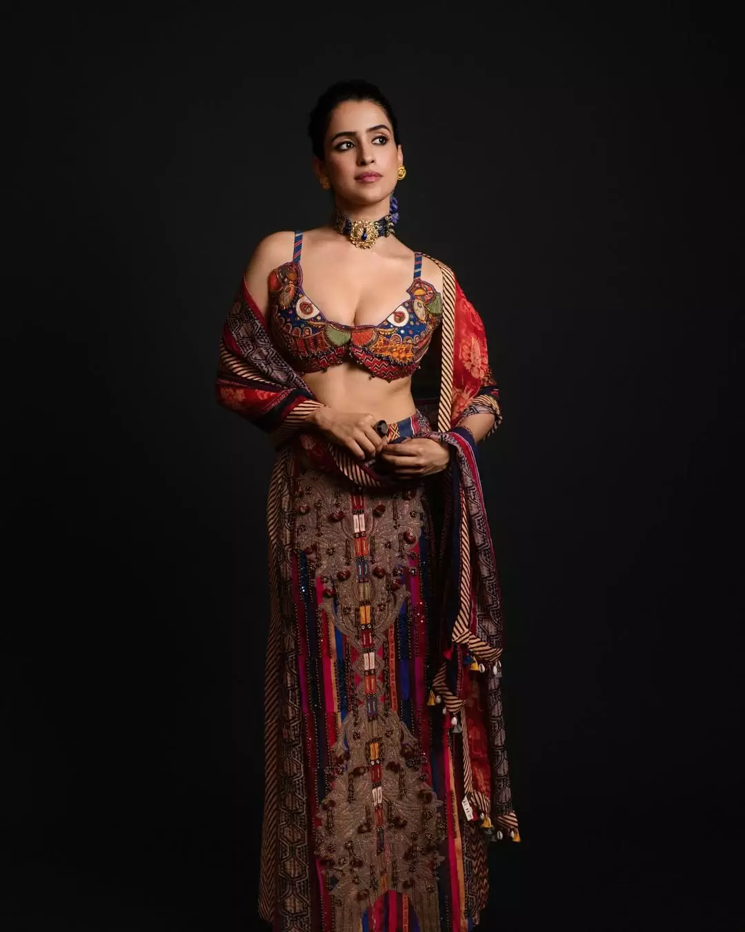Sanya Malhotra, the versatile Bollywood actress celebrated for her powerful performances and grounded persona, recently turned heads with a breathtaking ethnic look at the Zee Cine Awards. Draped in a vibrant, intricately embroidered lehenga-choli ensemble featuring bold multicolored patterns, a heavily embellished blouse, and a flowing dupatta, she exuded regal elegance against a dramatic black backdrop. Her statement neckpiece, earrings, and hair jewels added a touch of traditional glamour, perfectly complementing her poised expression and confident stance.In her heartfelt Instagram post, Sanya shared: "Another one for Mrs, another one for Richa Thank you @zeecineawards