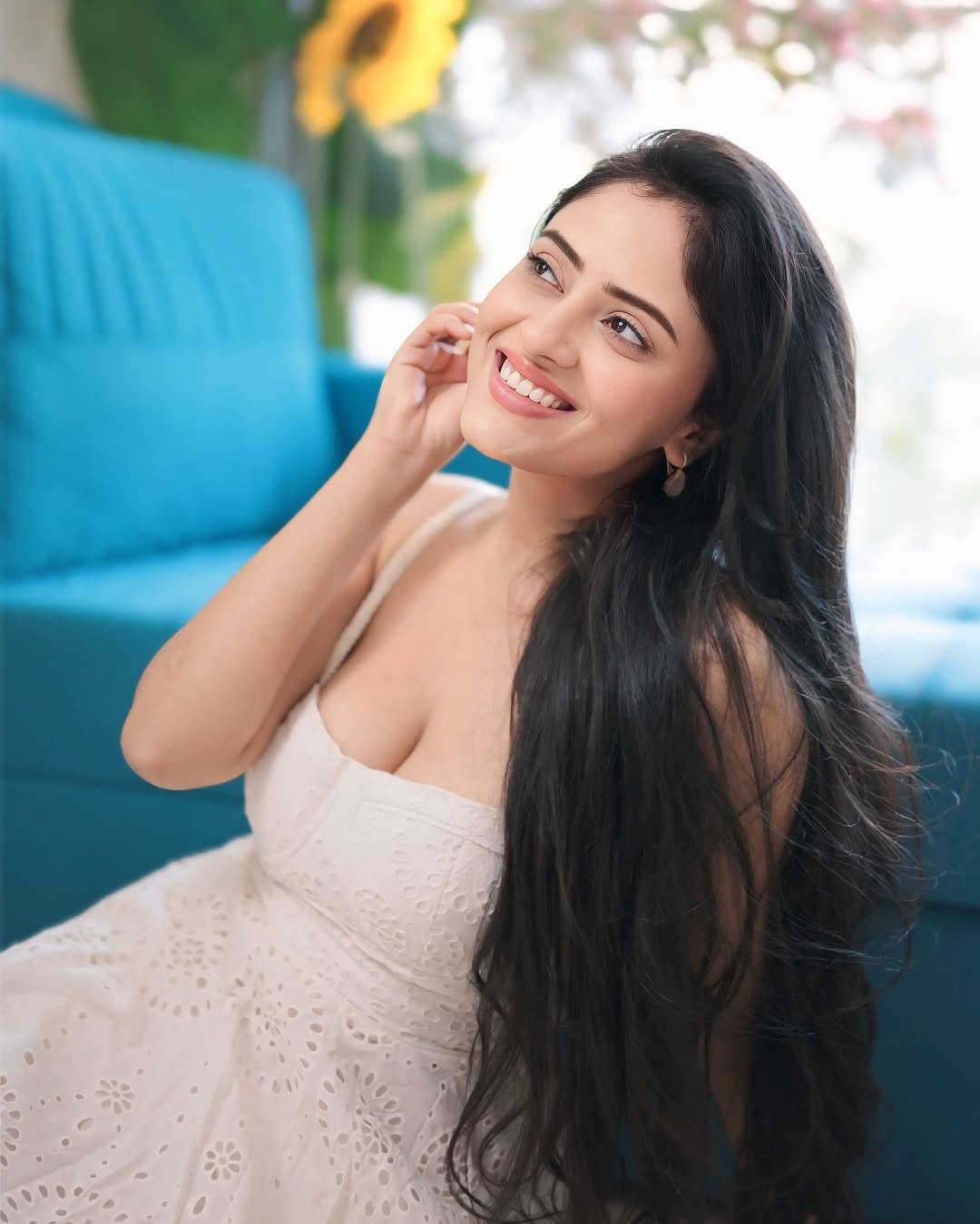 In her recent Instagram picture, Sanya Thakur exudes natural charm with her radiant smile and effortless style. Dressed in a delicate white dress with floral patterns, she looks graceful and serene.