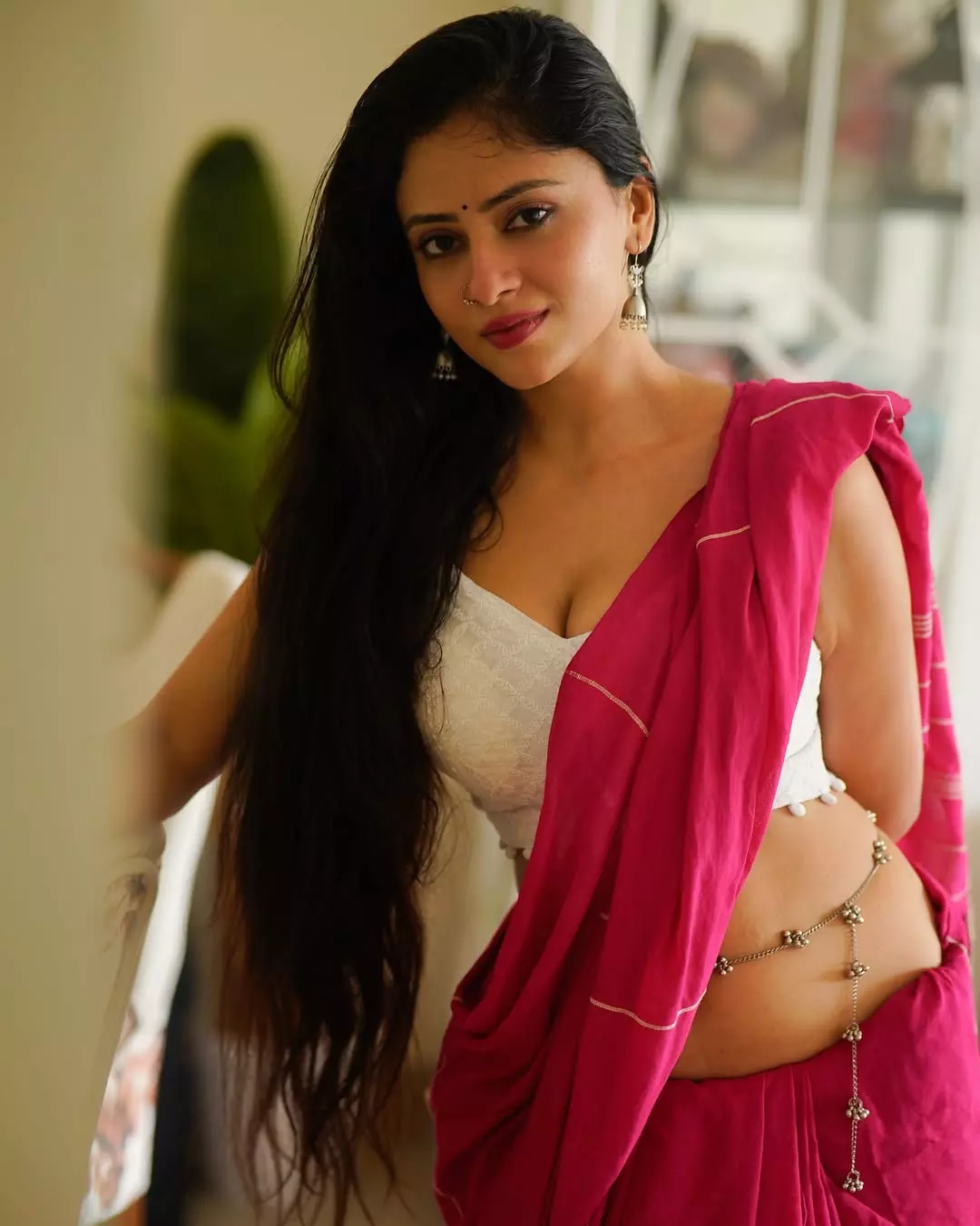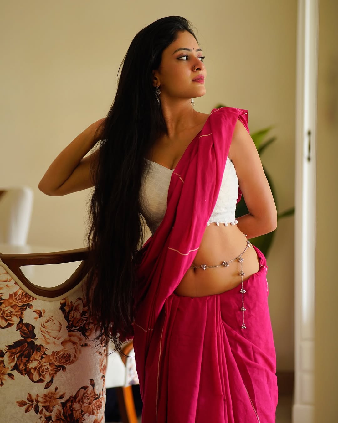 Sanya Thakur radiates charm and grace in this stunning traditional look. Draped in a vibrant pink saree paired with a chic white blouse, she brings a perfect blend of elegance and allure