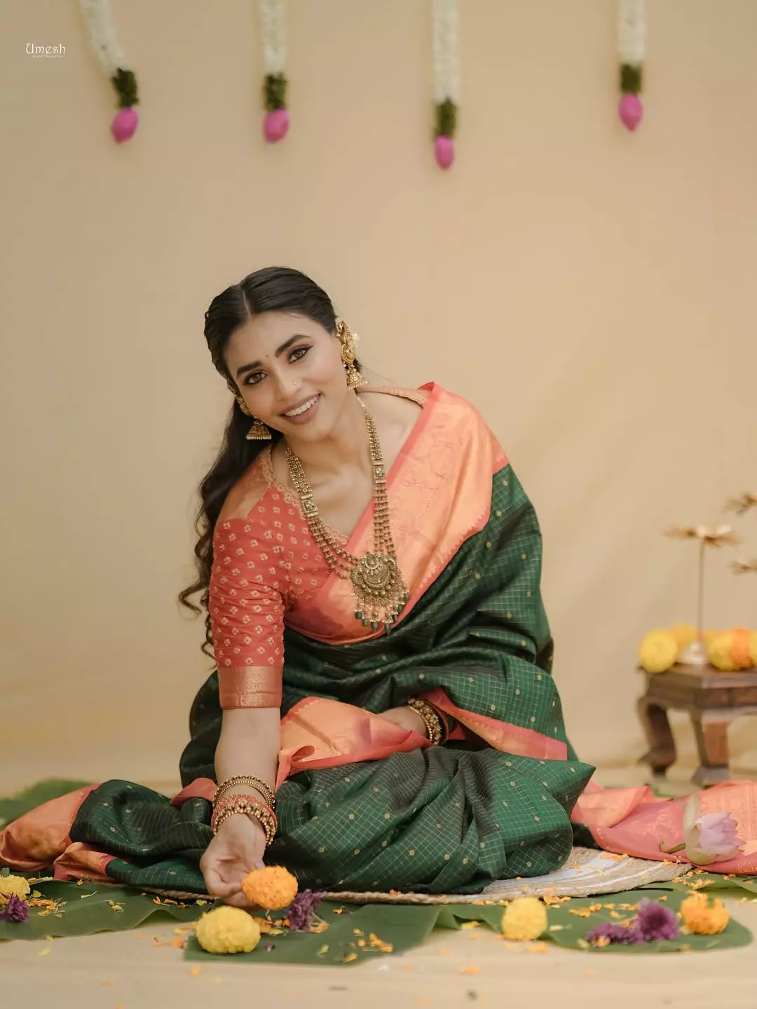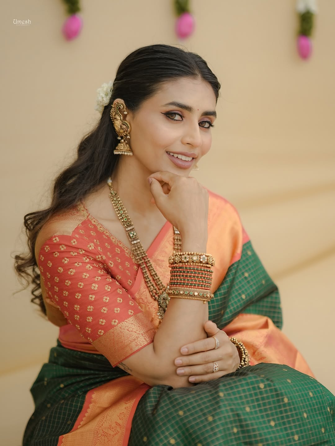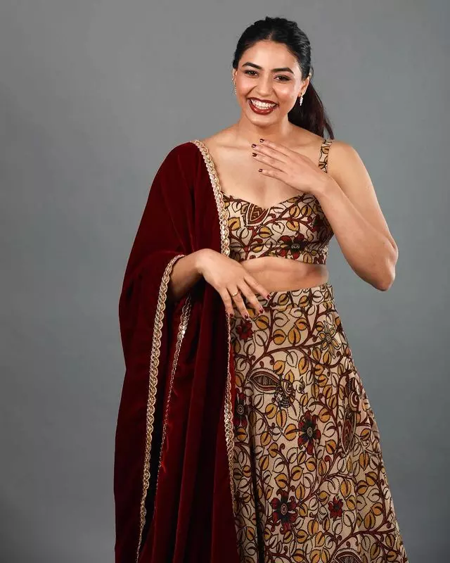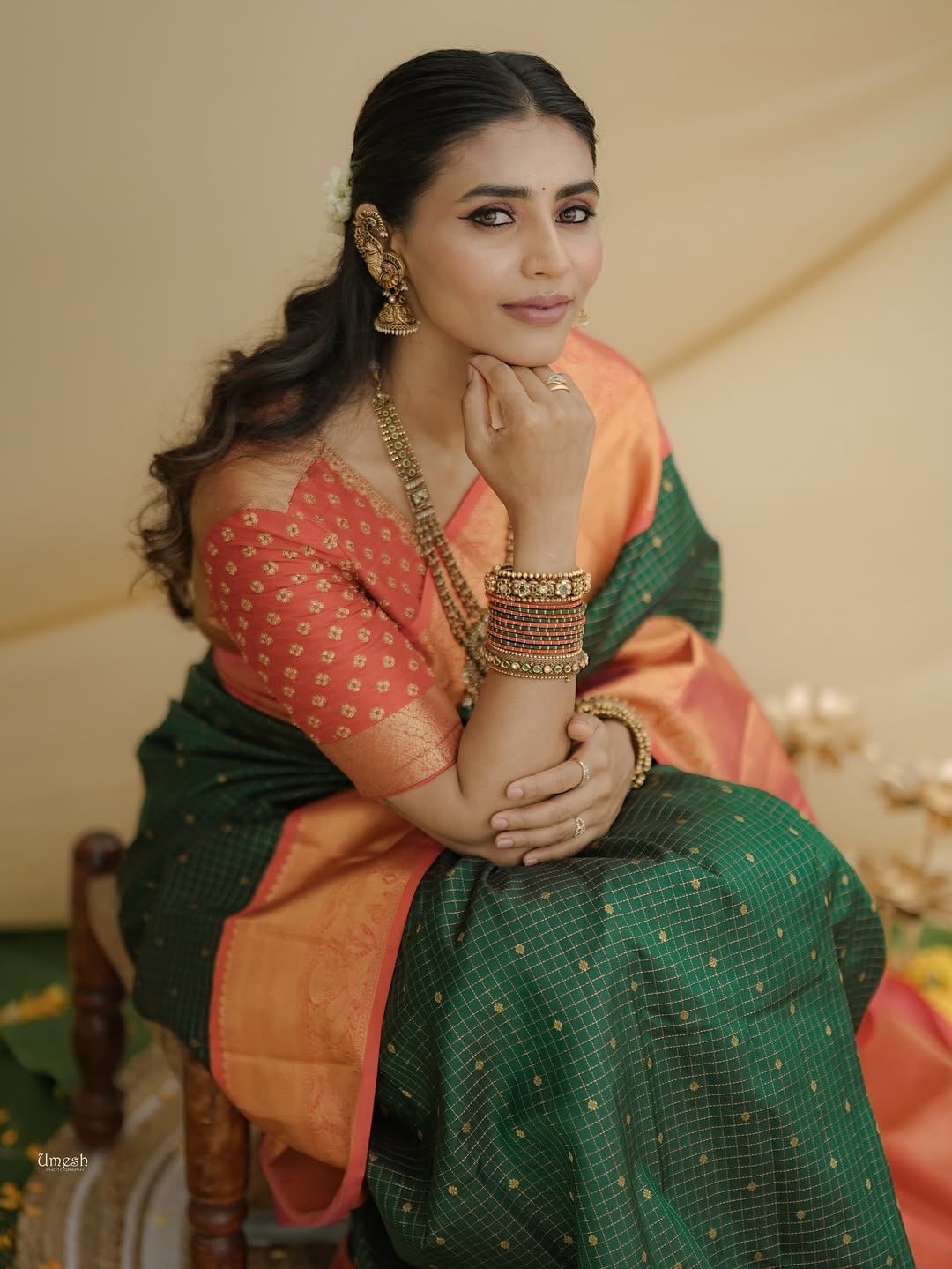 Her blouse was designed by Abhivyakti Keegadi Designs, which added a touch of sophistication to her entire look. The styling was done by Rachna Satish, who kept it simple yet rich in traditional elegance. The actress’s hair and makeup were handled by Romithokchom, who gave her a natural glow, enhancing her features without overpowering her traditional attire.