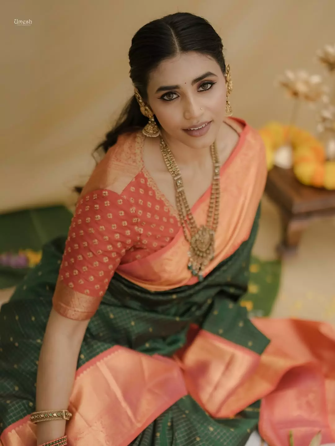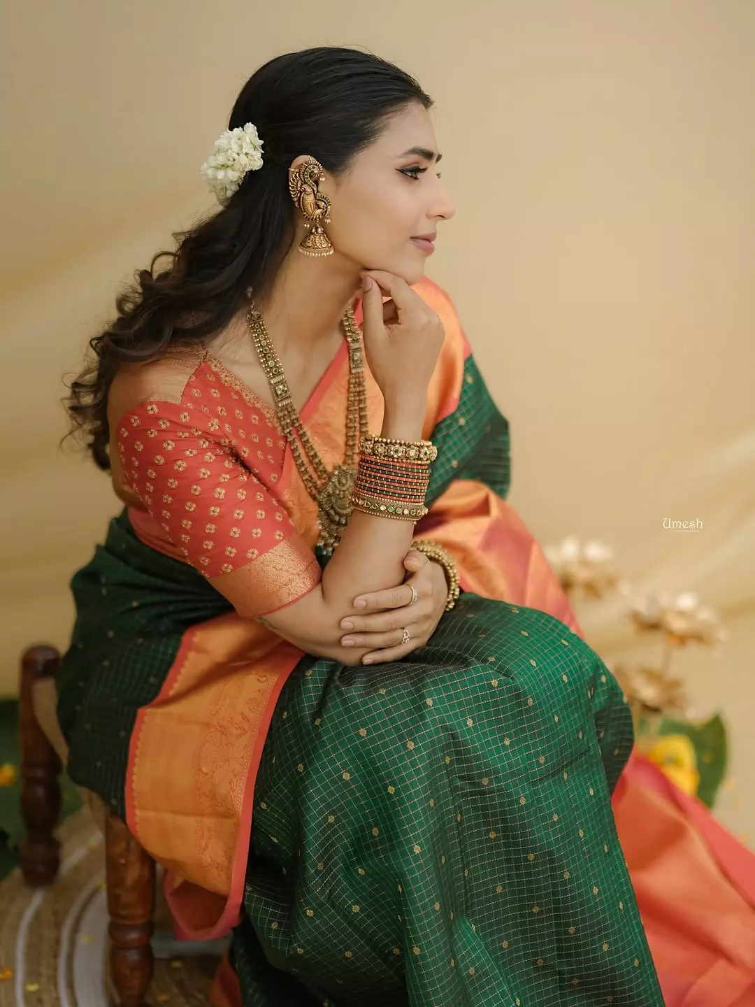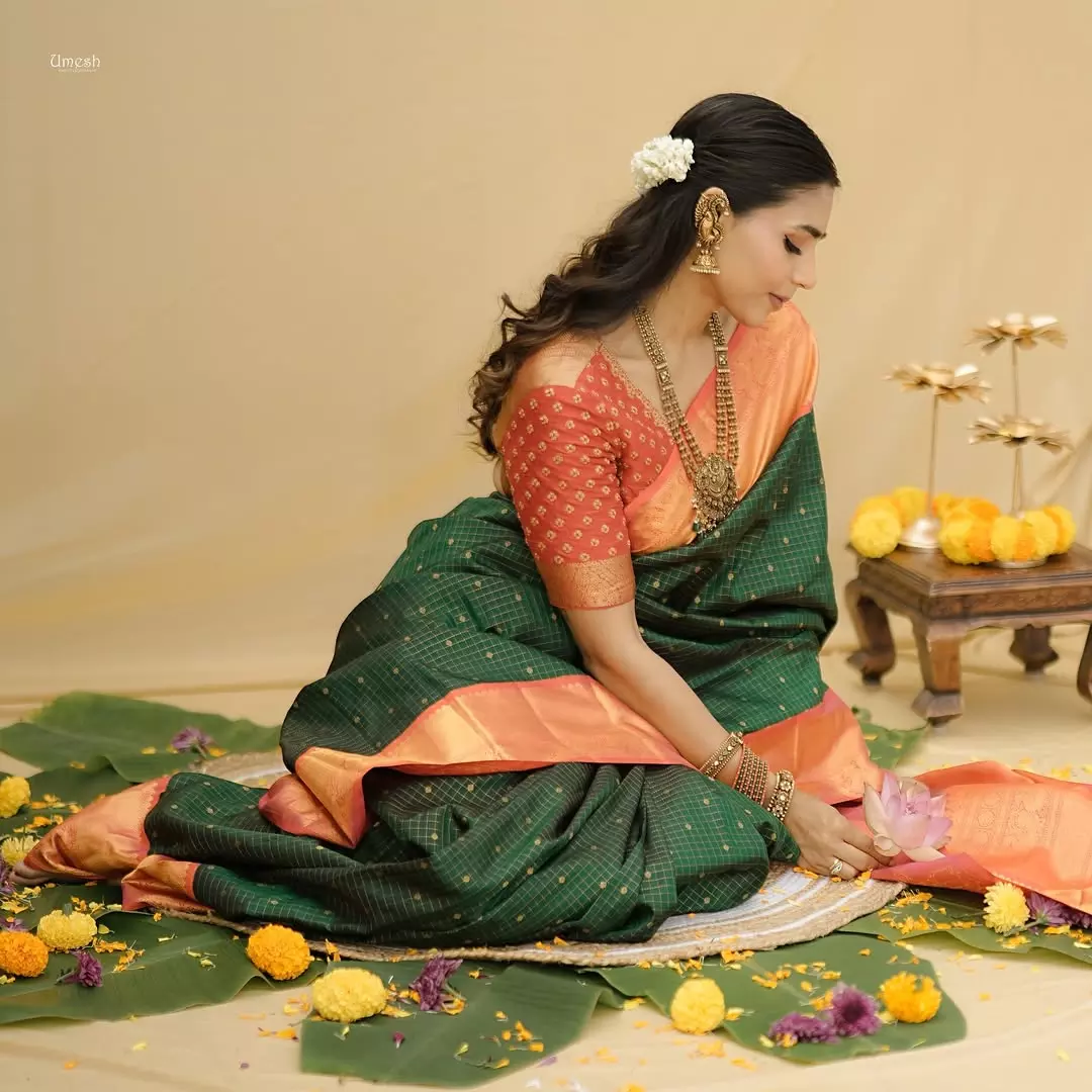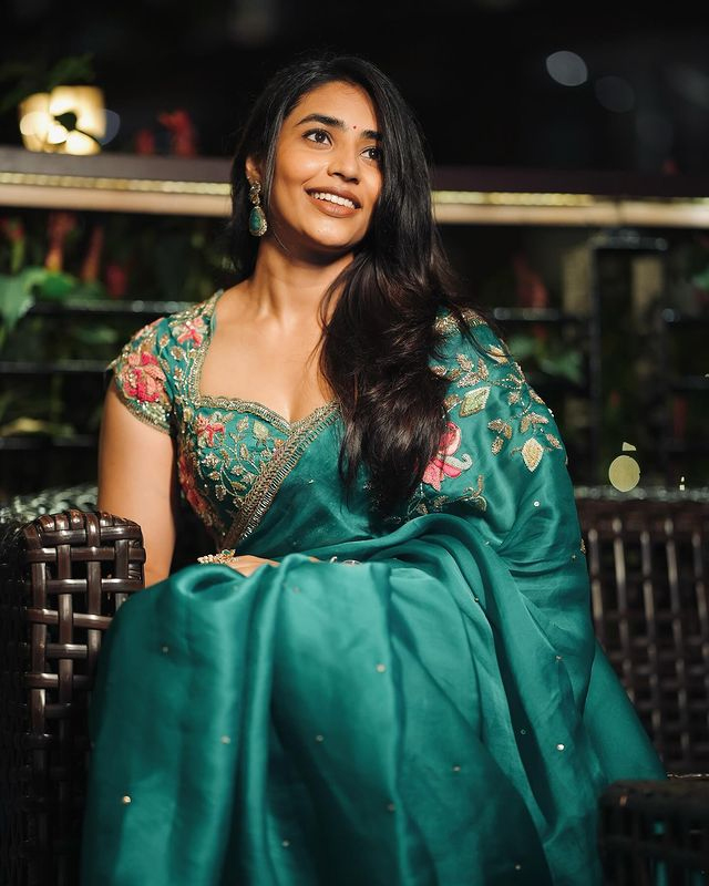 Her blouse was designed by Abhivyakti Keegadi Designs, which added a touch of sophistication to her entire look. The styling was done by Rachna Satish, who kept it simple yet rich in traditional elegance. The actress’s hair and makeup were handled by Romithokchom, who gave her a natural glow, enhancing her features without overpowering her traditional attire.