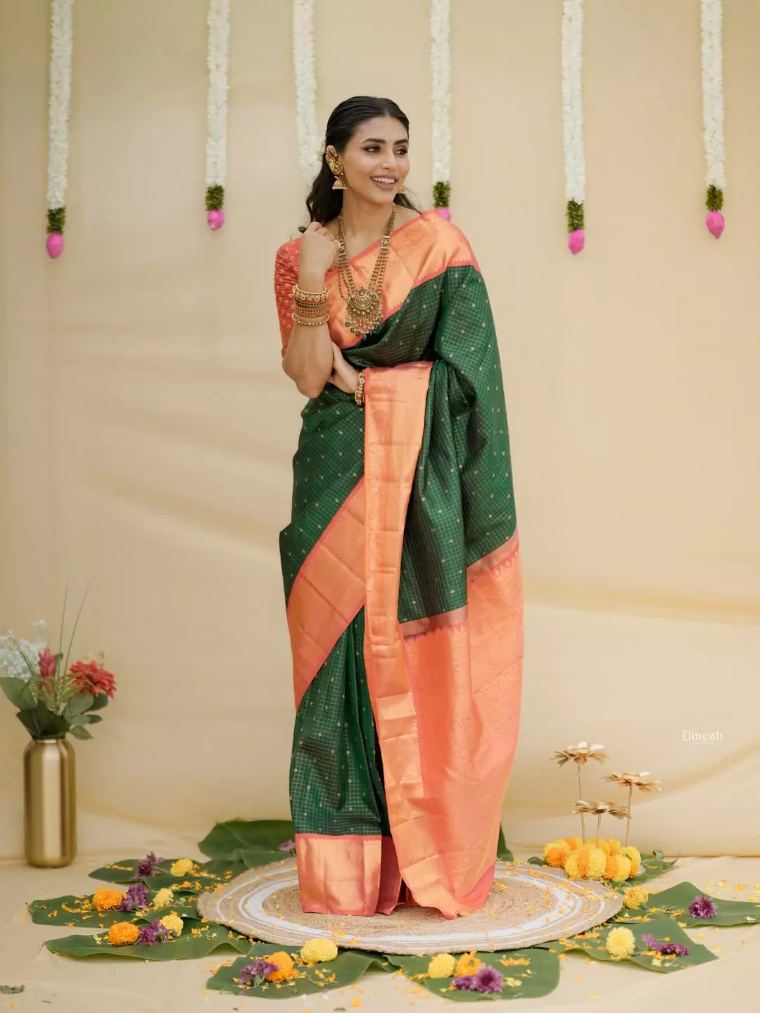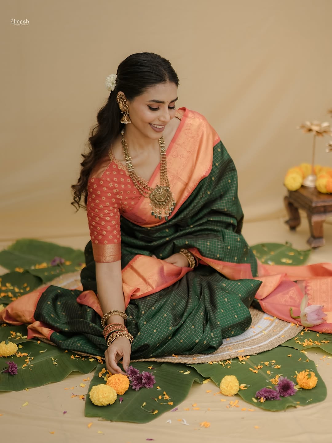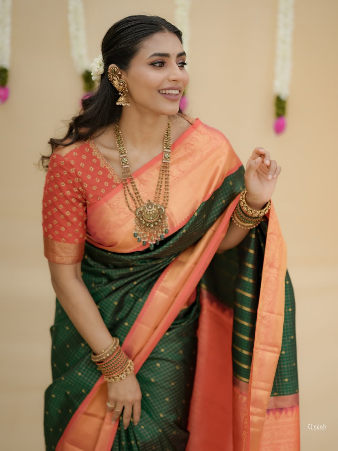In the photo, Sapthami wore a green silk saree with an elegant peach border, creating a perfect combination of tradition and charm. Her smile and natural confidence made the picture glow with festive warmth. The actress completed her traditional look with classic gold jewellery from Gajraj Jewellers, including bangles, earrings, and a long necklace that matched beautifully with her outfit.